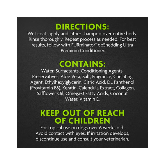 To use, wet coat and apply shampoo over entire body. Repeat process as needed. For best results, use with FURminator deShedding Ultra Premium Conditioner.