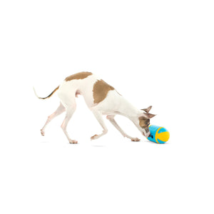 As dogs play, an internal protected weighted base causes the Rock 'N Treat to rock back and forth and side to side, dispensing kibble and rewarding the dog.