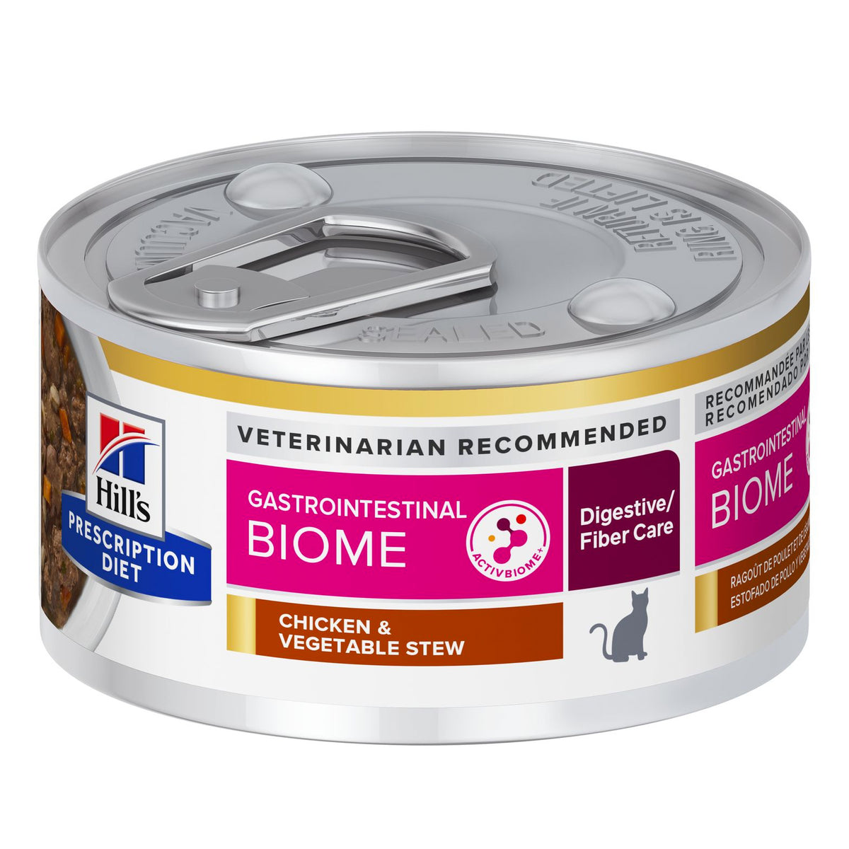 Hill's Prescription Diet Gastrointestinal Biome Stew for Cats is a complete dietetic pet food for the reduction of acute intestinal absorptive disorders and for compensation for maldigestion in adult cats. This dietetic pet food has an increased level of electrolytes, highly digestible ingredients and low level of fat.