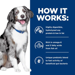 Hill’s Prescription Diet z/d Low Fat Hydrolysed Soy Recipe Dry Dog Food is nutrition specially formulated with hydrolysed soy protein and low fat levels to help avoid adverse food reactions and promote healthy skin in dogs with food and fat sensitivities. This recipe is fortified with Hill's breakthrough ActivBiome+ ingredient technology clinically shown to rapidly activate the gut microbiome to support digestive health and well-being.