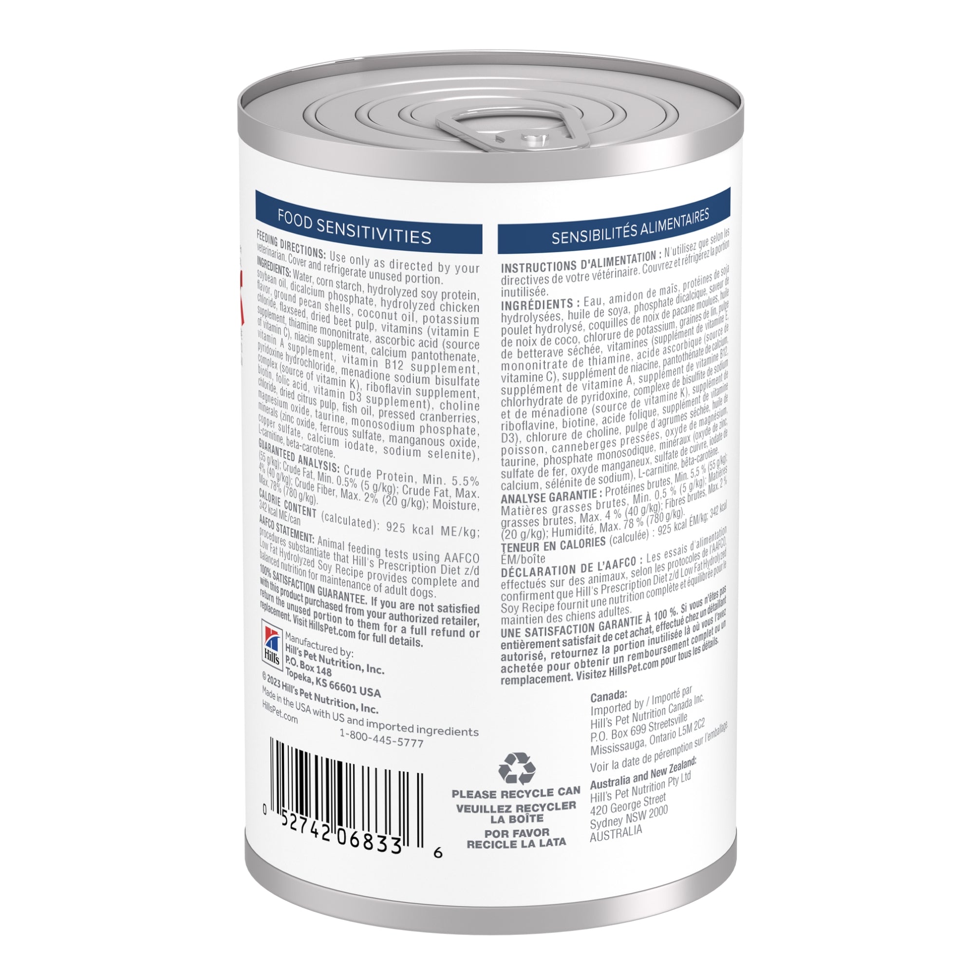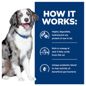 Hill's Prescription Diet z/d Low Fat Hydrolysed Soy Recipe Wet Dog Food is nutrition specially formulated with hydrolysed soy protein and low fat levels to help avoid adverse food reactions and promote healthy skin in dogs with food and fat sensitivities. This recipe is fortified with Hill's breakthrough ActivBiome+ ingredient technology clinically shown to rapidly activate the gut microbiome to support digestive health and well-being.