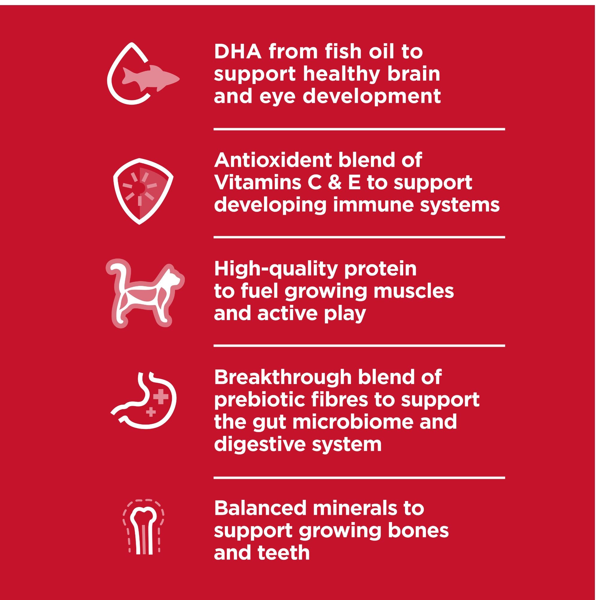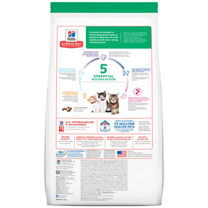 Your little kitten needs premium nutrition that can keep up with their active lifestyle. Hill's Science Diet Kitten dry food is specially formulated with vital nutrients to support 5 essential building blocks for lifelong health, so they get the best start in life & grow to their full potential. This cat food provides DHA from fish oil for healthy eye & brain development for kittens and high-quality protein to fuel your growing cat's muscles and active play. Balanced minerals promote strong bones and strong teeth.