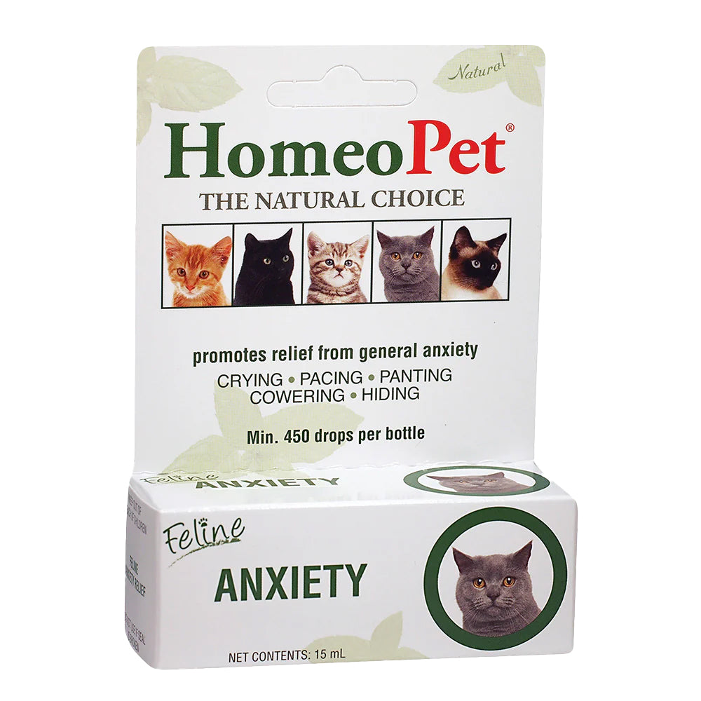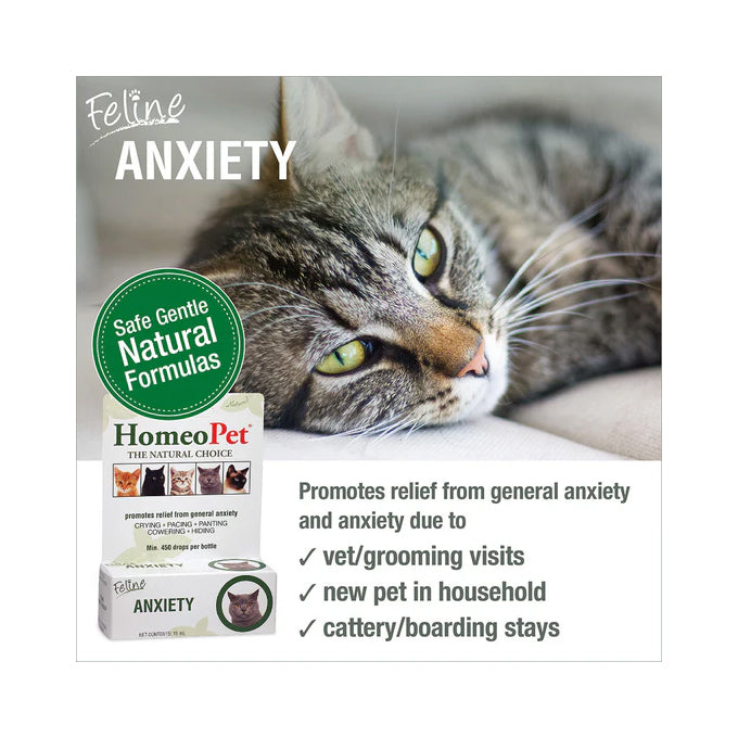 HomeoPet Feline Anxiety is a natural homeopathic remedy that may promote relief from general anxiety in cats and kittens during vet/grooming visits, as a result of a new pet in household and separation from familiar surroundings caused by cattery/boarding stays.