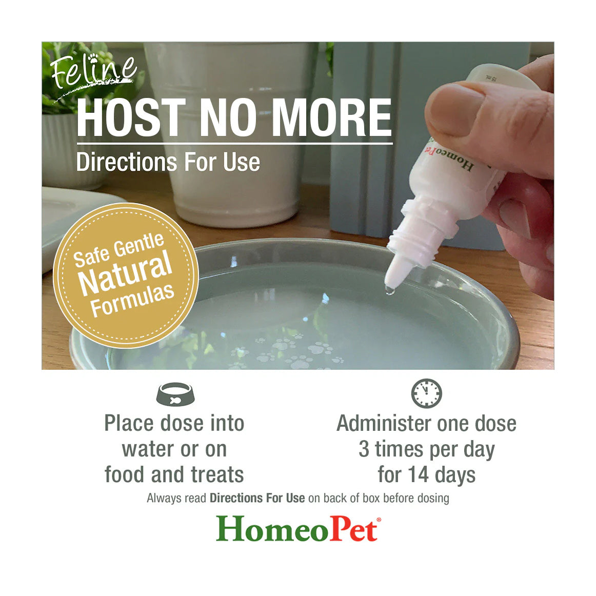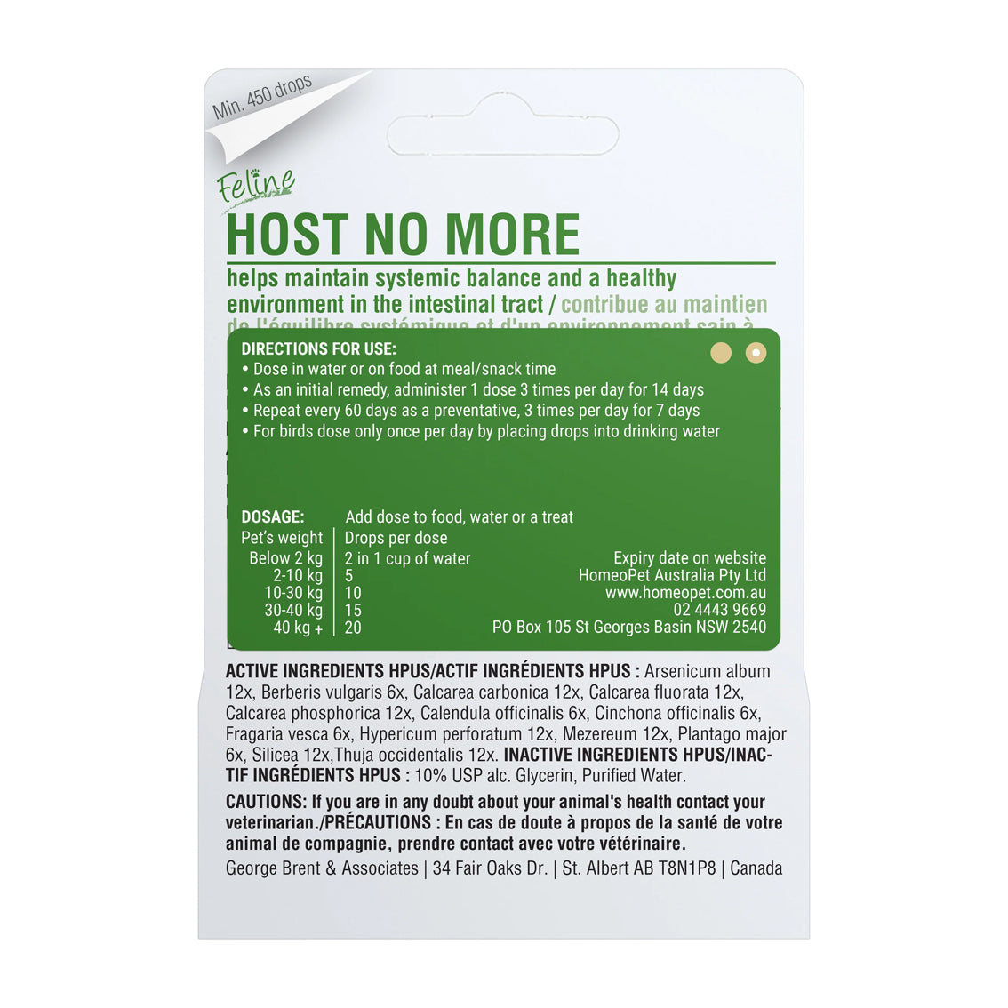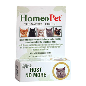HomeoPet Feline Host No More works internally to help maintain intestinal systemic balance and a healthy environment in the intestinal tract.