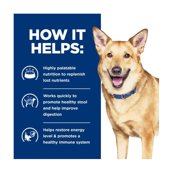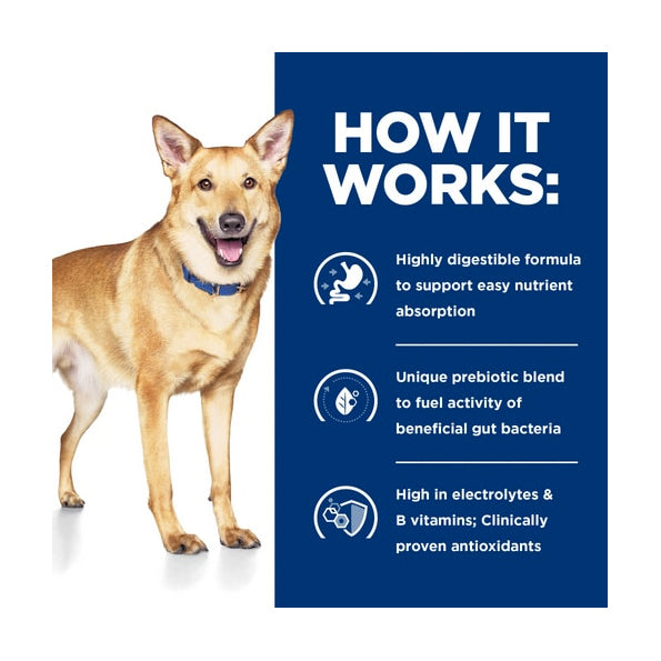 This highly digestible food is enriched with electrolytes and B vitamins to ensure easy nutrient absorption and replace lost nutrients. Made with Hill's proprietary ActivBiome+ Ingredient Technology, a special blend of prebiotic fibres, clinically shown to rapidly activate the gut microbiome to support optimal stool quality and digestive health. Fortified with Omega 3 & 6 fatty acids and clinically proven antioxidants to help support a healthy immune system.