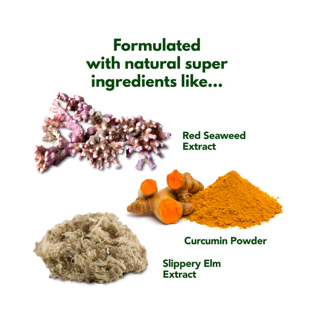 Red Seaweed Extract, Curcumin Powder, Digestive Enzymes, Glutamine & Threonine, Mycotoxin Binder, Slippery Elm Extract, Aniseed Oil, Prebiotic and Probiotic.