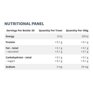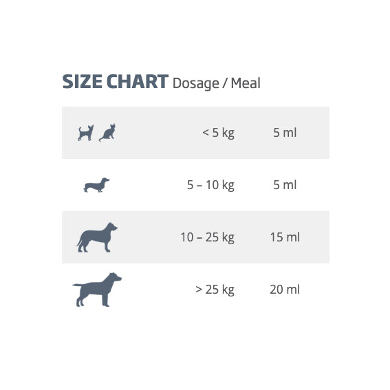 As per suggested serving size chart, measure required volume per body weight range then add to your pet’s meal and stir. One serve equals approximately ½ a tablespoon. Consume within 60 days.