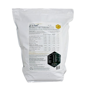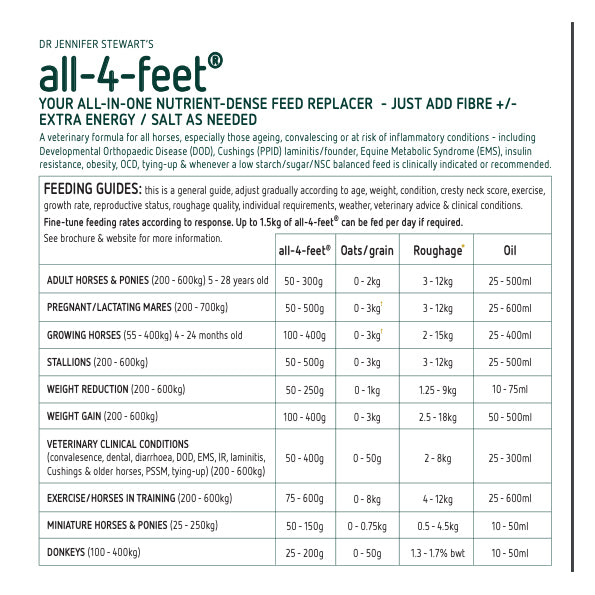 all-4-feet® is an all-in-one nutrient base—add appropriate fibre and, if required, extra energy, salt or oil. Adjust gradually based on condition, workload and veterinary advice. Up to 1.5kg per day can be fed if needed. Fine-tune according to response.