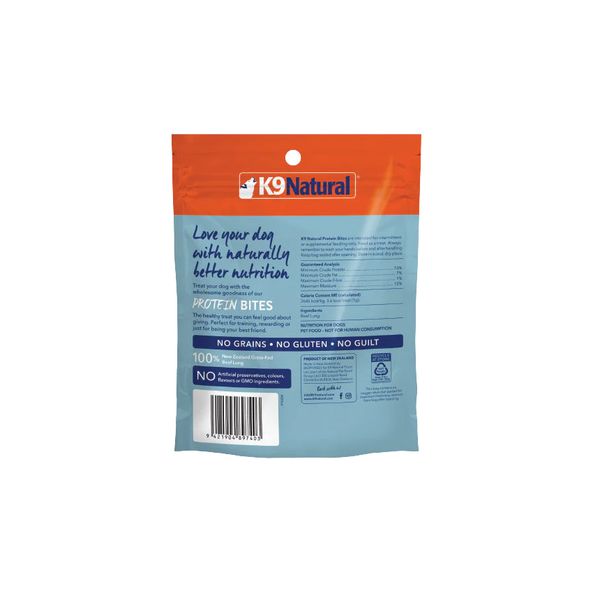 Air-Dried slowly, K9 Natural Beef Lung Protein Bites are an everyday treat packed with lung protein sourced from 100% New Zealand grass-fed, free range Beef. Perfect for on-the-go, your dog will enjoy the dense jerky-like texture and you will love your crumb free pocket!