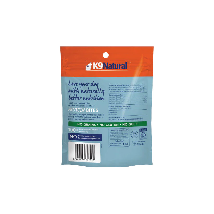 Air-Dried slowly, K9 Natural Lamb Lung Protein Bites are an everyday treat packed with lung protein sourced from 100% New Zealand grass-fed, free range Lamb. Perfect for on-the-go, your dog will enjoy the dense jerky-like texture and you will love your crumb free pocket!