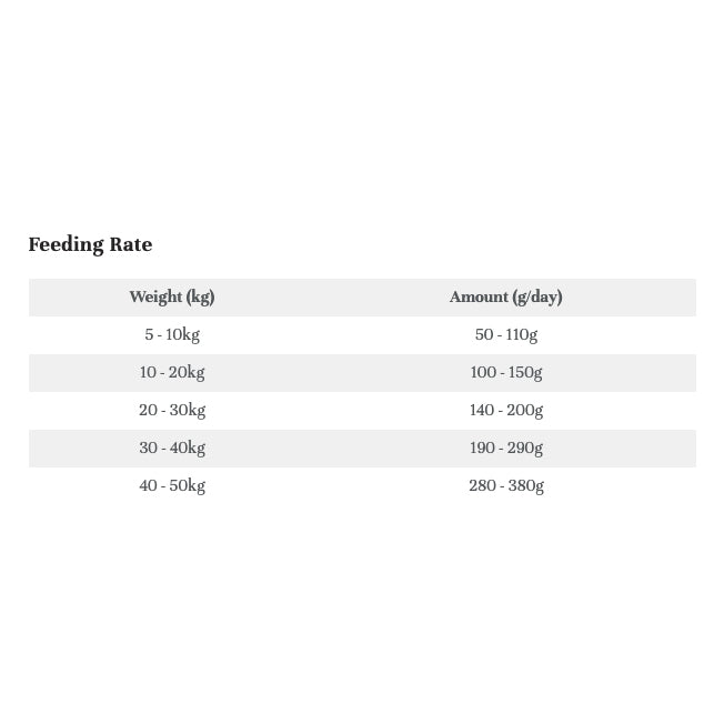 Specifically developed in conjunction with the science of nutrigenomics, this food can be fed continuously, and used as a nutritional aid in the treatment of dogs suffering chronic mobility issues and arthritis. The energy density is 16.5MJ/kg (395 kcal/100g) and is free of GMO’s, dairy, wheat, corn, soy and sugar. Manufactured and tested under ISO 17025 standards.