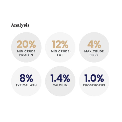 Lamb and lamb fat, oat groats, rice, poultry oil stabilised with vitamin E and rosemary oil, omega 3 6 9 oil blend, sweet lupins, alfalfa, spinach, parsley, kelp, carrot, yeast cell wall extract, glucosamine, chondroitin, vitamins A, B1, B2, B6, B12, C, D3, E, K, niacin, pantothenate, folic acid, biotin and natural organic acids, minerals calcium, phosphorus, sodium, copper, zinc, iron, manganese and iodine. Also contains natural flavours and Yucca schidigera extract.
