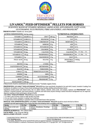 Livamol Feed Optimiser Pellets have been specifically formulated to be used with Livamol, Australia's Leading Coat Conditioner, for addition to all types of horse feeds including growing, breeding, spelling and performance horses.