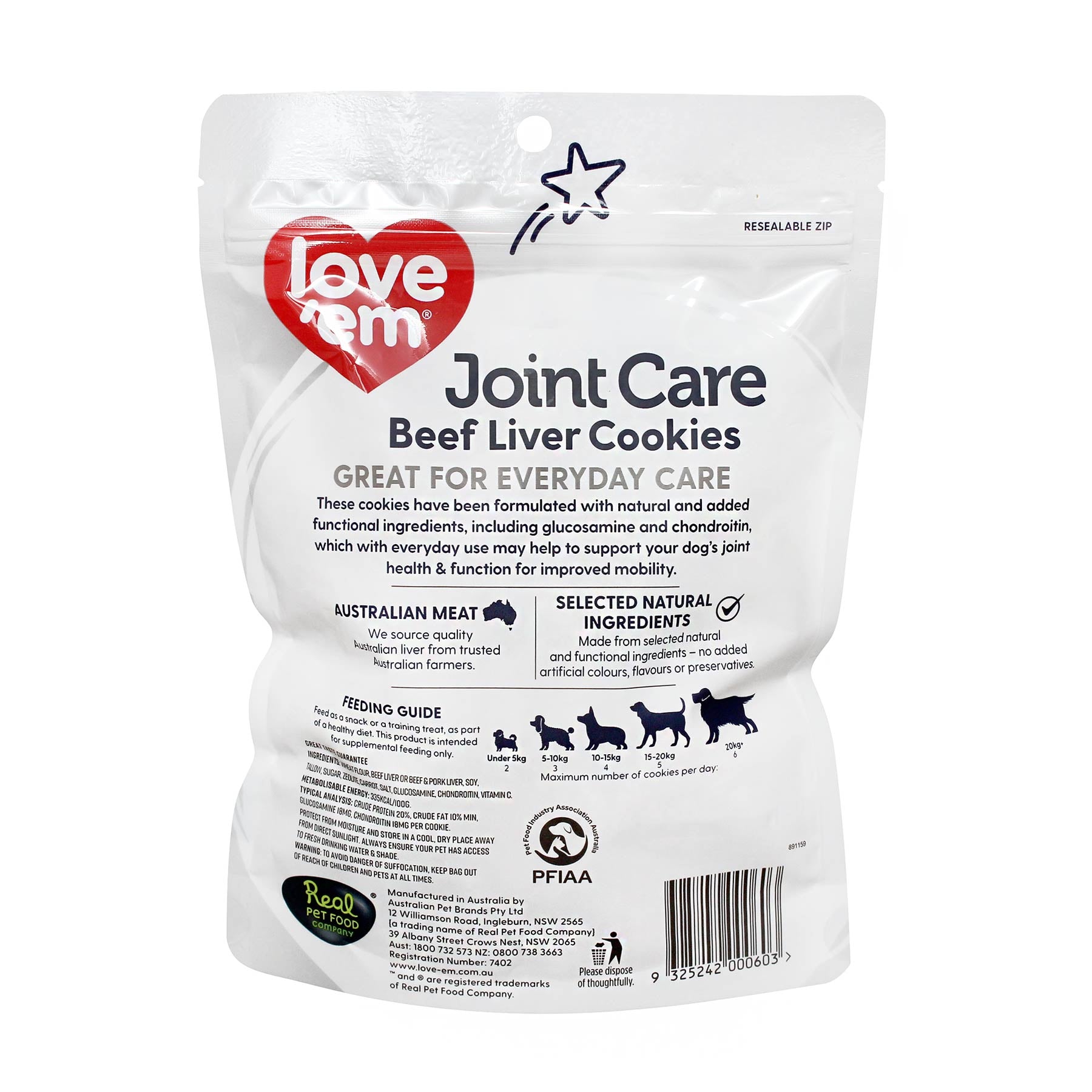 Love’em Joint Care Beef Liver Cookies are formulated to support good joint function. These tasty cookies are fortified with natural and functional ingredients such as glucosamine and chondroitin, which help to maintain joint health.