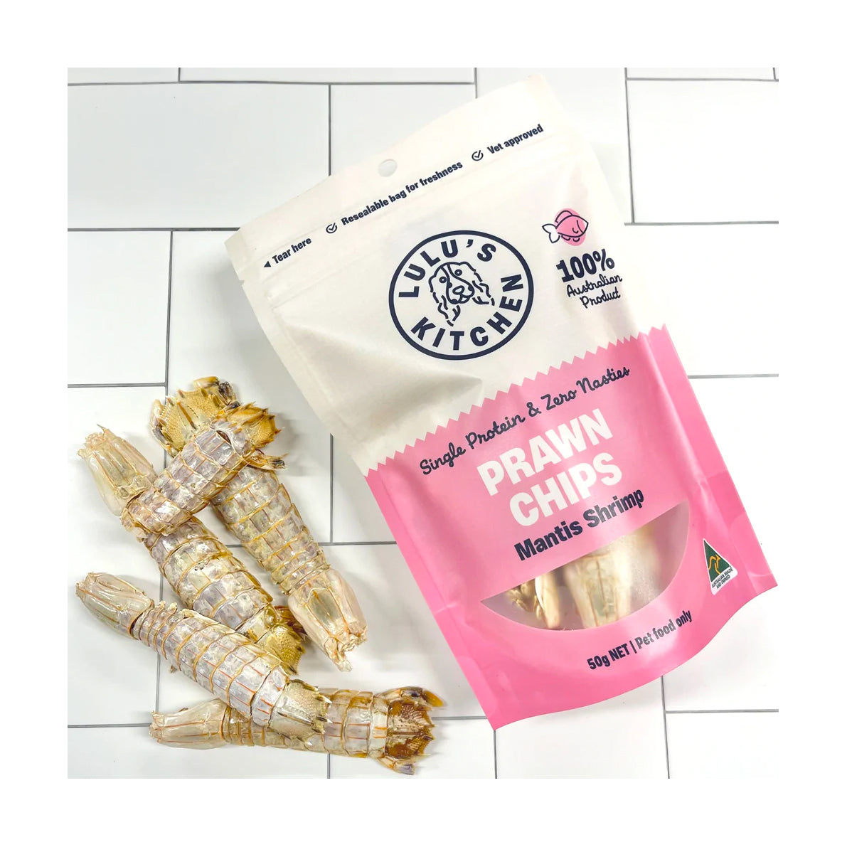 Lulu’s Kitchen Prawn Chips are made from Mantis Shrimp. Mantis Shrimp is a hypoallergenic, densely nutritional treat for your dog!