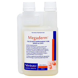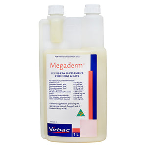 Megaderm is an omega 3 and omega 6 supplement for dogs and cats.