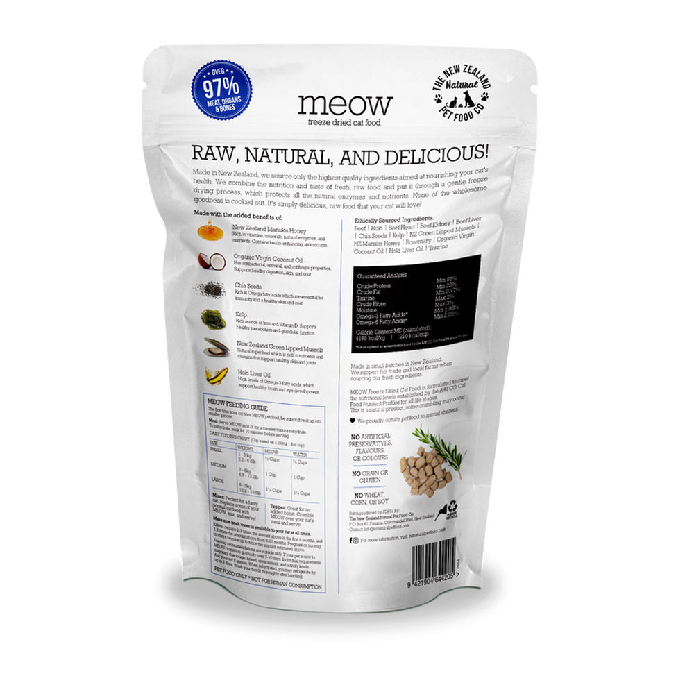 MEOW is made using only the highest quality ingredients aimed at nourishing your pet's health. We combine the nutrition and taste of fresh, raw food and put it through a gentle freeze drying process which protects all the natural enzymes and nutrients, so none of the wholesome goodness is cooked out.