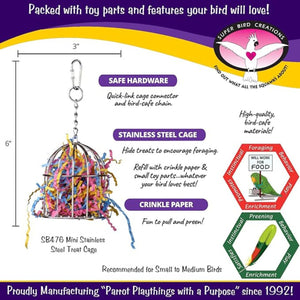 Our green-cheek conure Sprout loves foraging for his paper straws with treats inside mixed in with the shredded paper in the little cage. It’s a great size for him and I’ll also switch it around for my rainbow lorikeet and cockatiel to try.