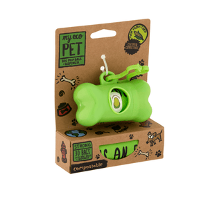 Dispenser Kit Contains 2 rolls of MyEcoBag compostable bags (15 bags per roll - Bags 30 x 22cm each) and 1 x bone shaped dispenser.
