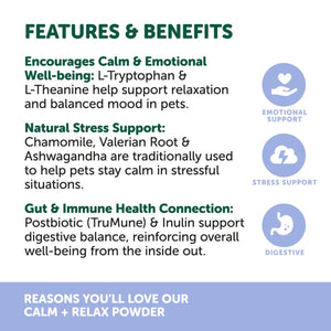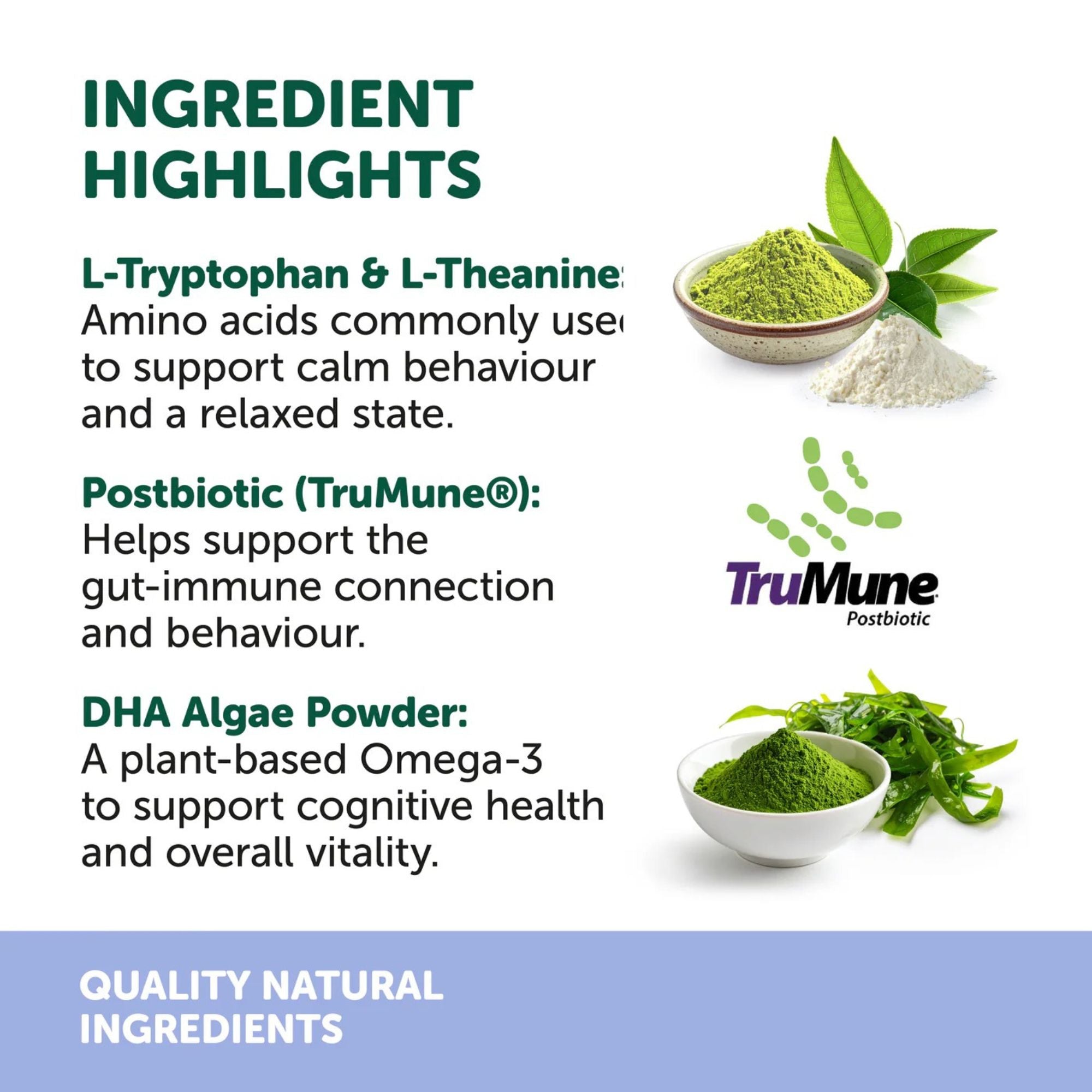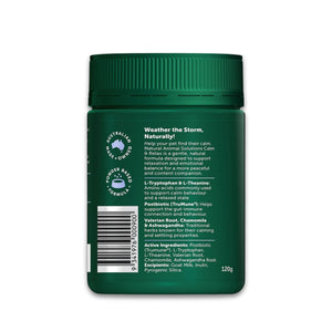 L-Tryptophan and L-Theanine work together to encourage relaxation and emotional balance, helping pets feel more at ease. Chamomile, Valerian Root and Ashwagandha are traditionally used to support stress resilience, providing a natural way to help pets stay calm in anxious moments.