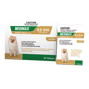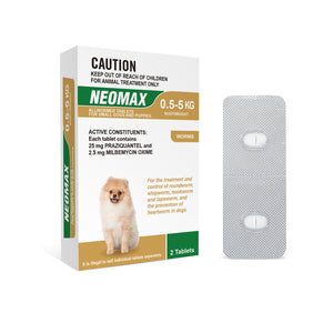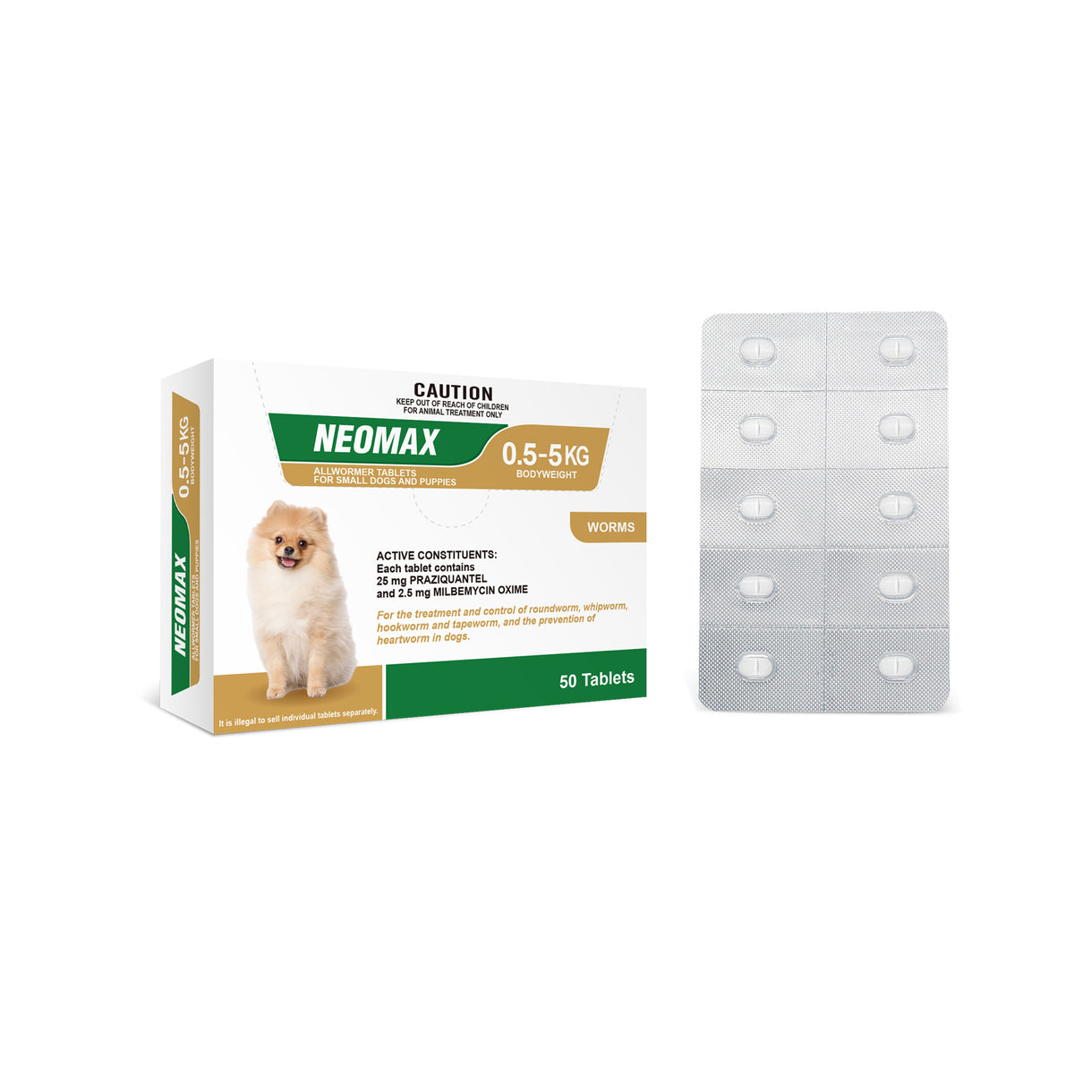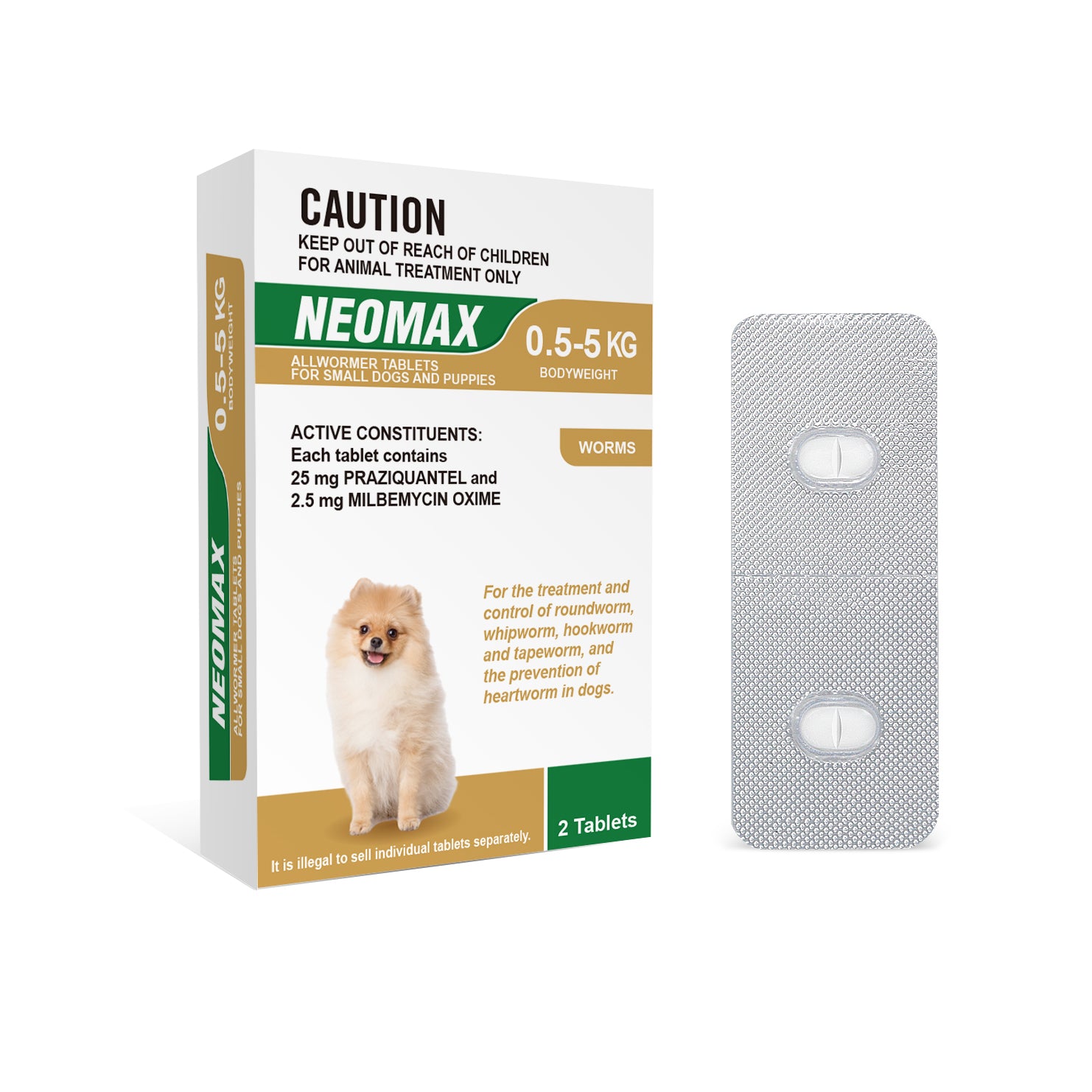 Neomax Allwormer Tablets for Small Dogs and Puppies (0.5 – 5 kg bodyweight) deliver 25 mg praziquantel and 2.5 mg milbemycin oxime per tablet, combining broad‑spectrum intestinal worm treatment with monthly heartworm prevention.
