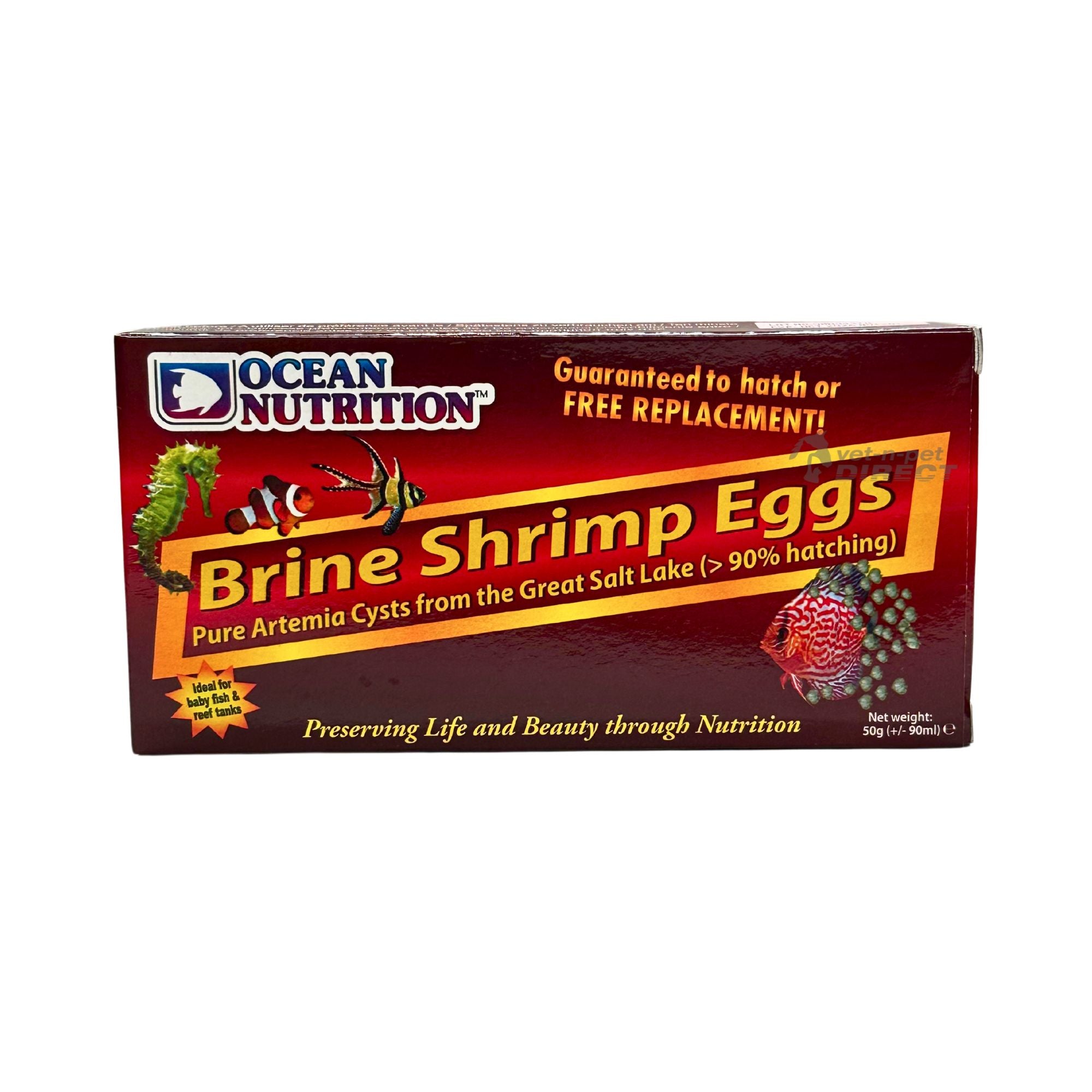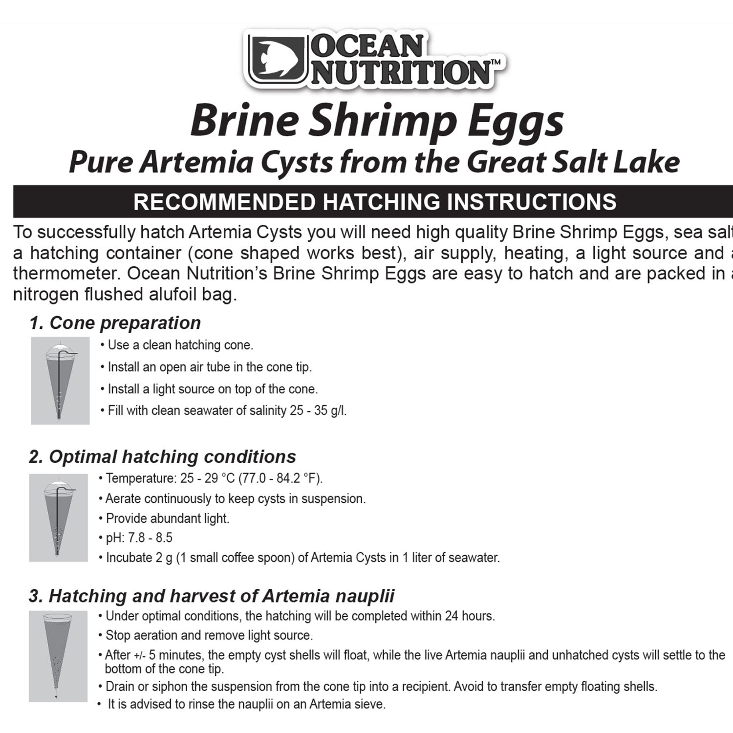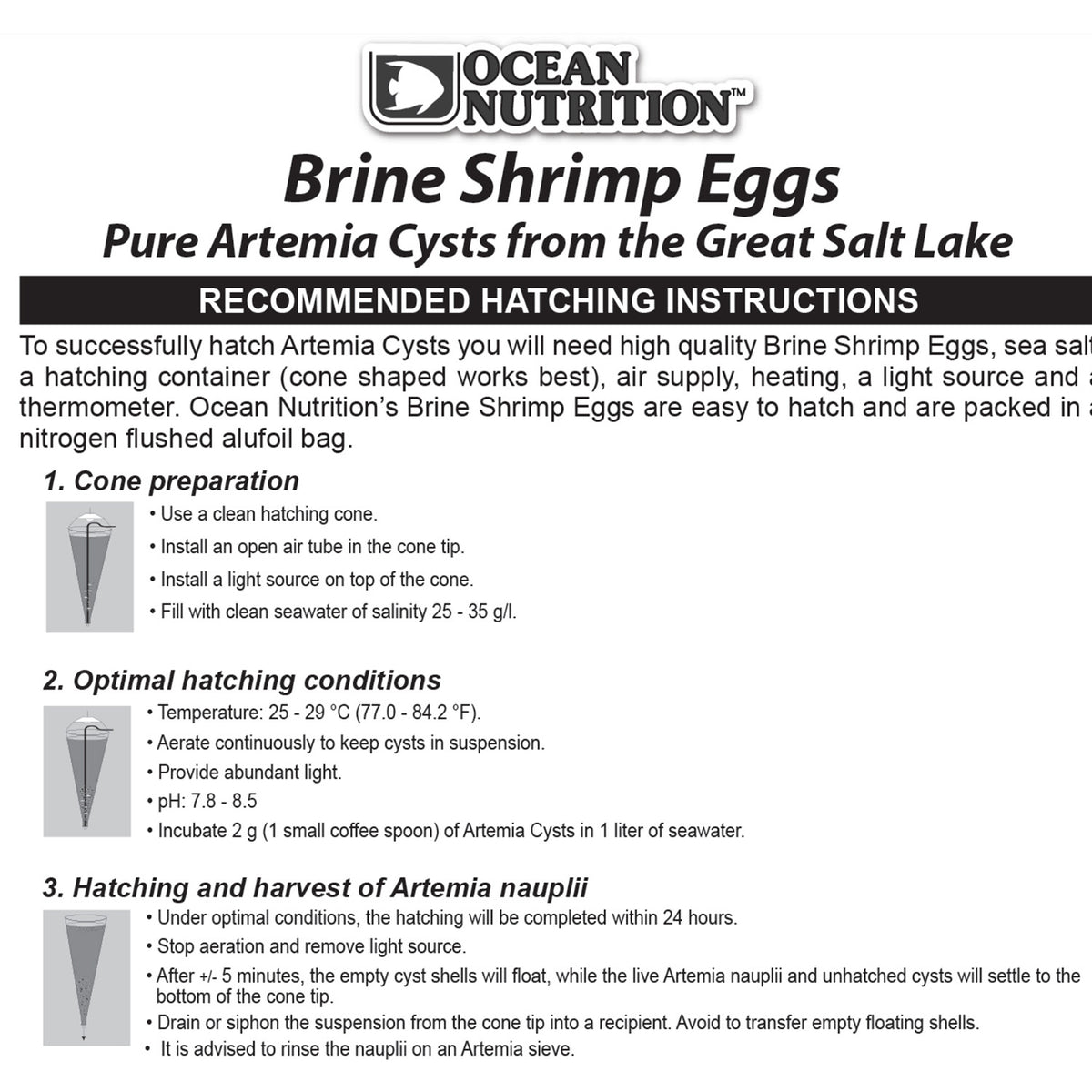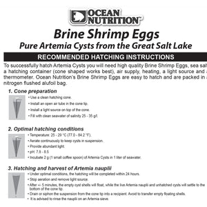Ocean Nutrition Artemia Cysts, also known as Brine Shrimp Eggs, have a hatching percentage of more than 90%. They will hatch into Artemia nauplii (baby brine shrimp) in 18 to 30 hours. Artemia nauplii are known to be the ideal live food for the first stages of many marine and freshwater tropical fish and for many invertebrates.