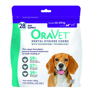 OraVet Dental Hygiene Chews contain a special ingredient, delmopinol. Delmopinol forms a barrier that prevents bacteria from attaching to the teeth, reducing the build-up of plaque and tartar.
