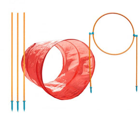 The Zip & Zoom outdoor agility kit features 1 circular collapsible tunnel, 6 weave poles, and an adjustable jump with hoop.