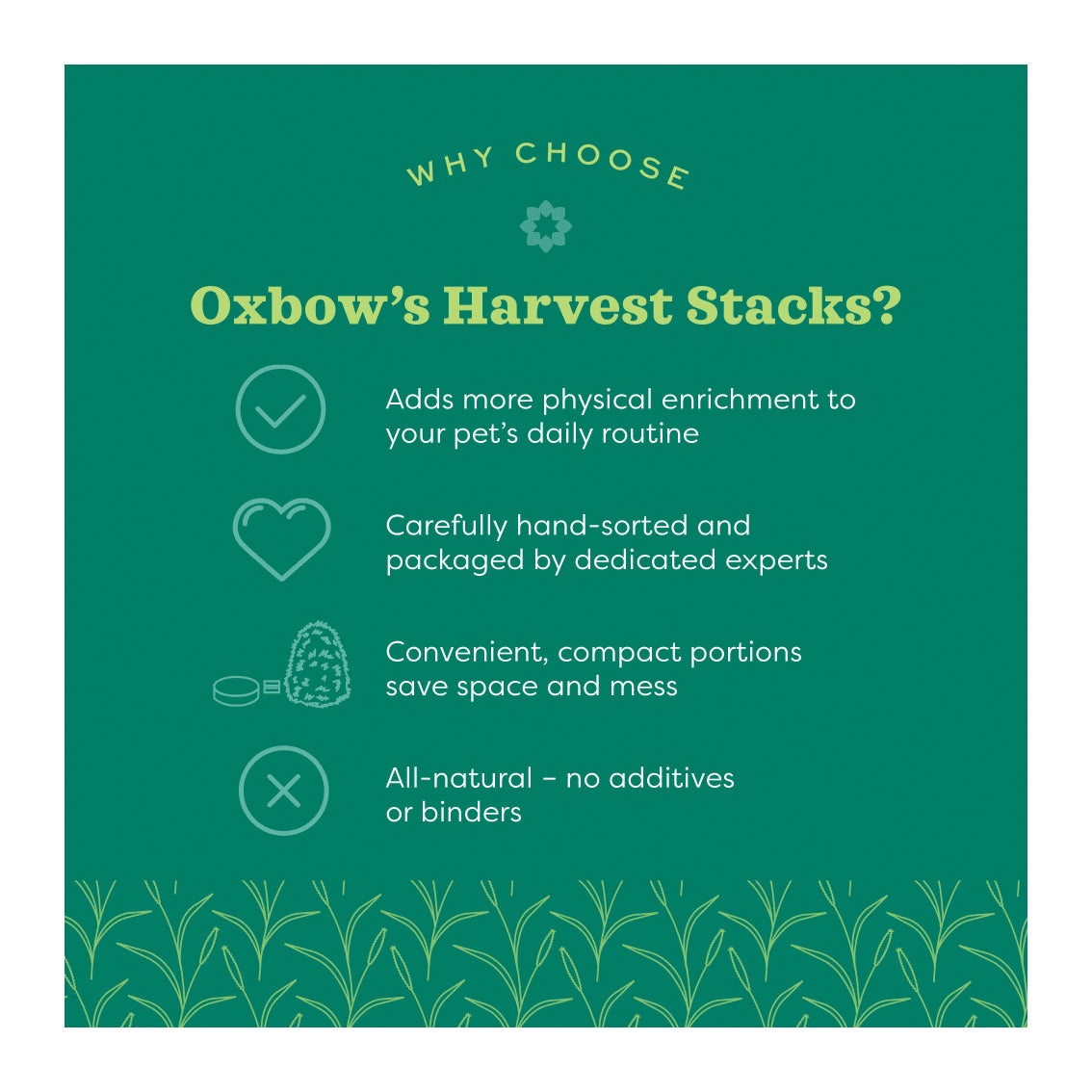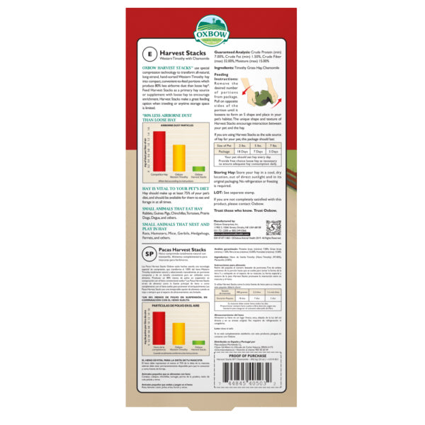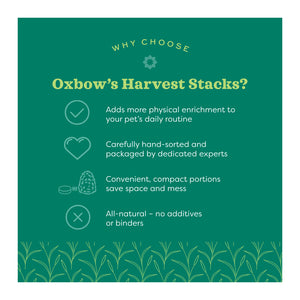 The classic Stack with a calming, herbal twist. Oxbow’s Harvest Stacks – Western Timothy with Chamomile features all-natural Western Timothy Hay in an innovative, enriching format. The addition of chamomile makes this product impossible for rabbits, guinea pigs, chinchillas, and other small herbivores to resist.