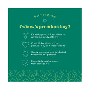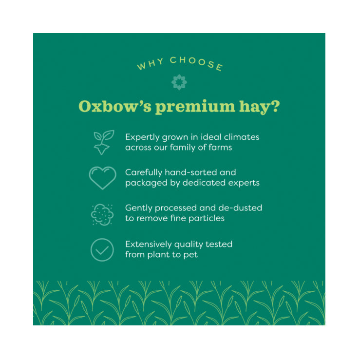 Oxbow’s hearty, hand-selected Oat Hay is a favourite of many rabbits, guinea pigs, and chinchillas. Oxbow Oat Hay is harvested before the oat develops into a seed, providing savoury husks full of flavour and fibre. Its aroma will stimulate your pet’s appetite and encourage him eat more hay. Your pet should have unlimited grass hay every day.