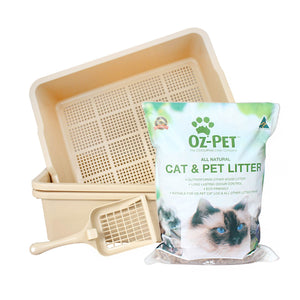 The Oz-Pet litter tray is designed specifically for use with Oz-Pet wood litter. The tray is made up of two parts and a spare base, with the top section used as a sieve. When Oz-Pet is wet, it breaks down into smaller particles, which then fall through into the bottom tray when shaken once or twice a day. The spare base is used for rotation cleaning.