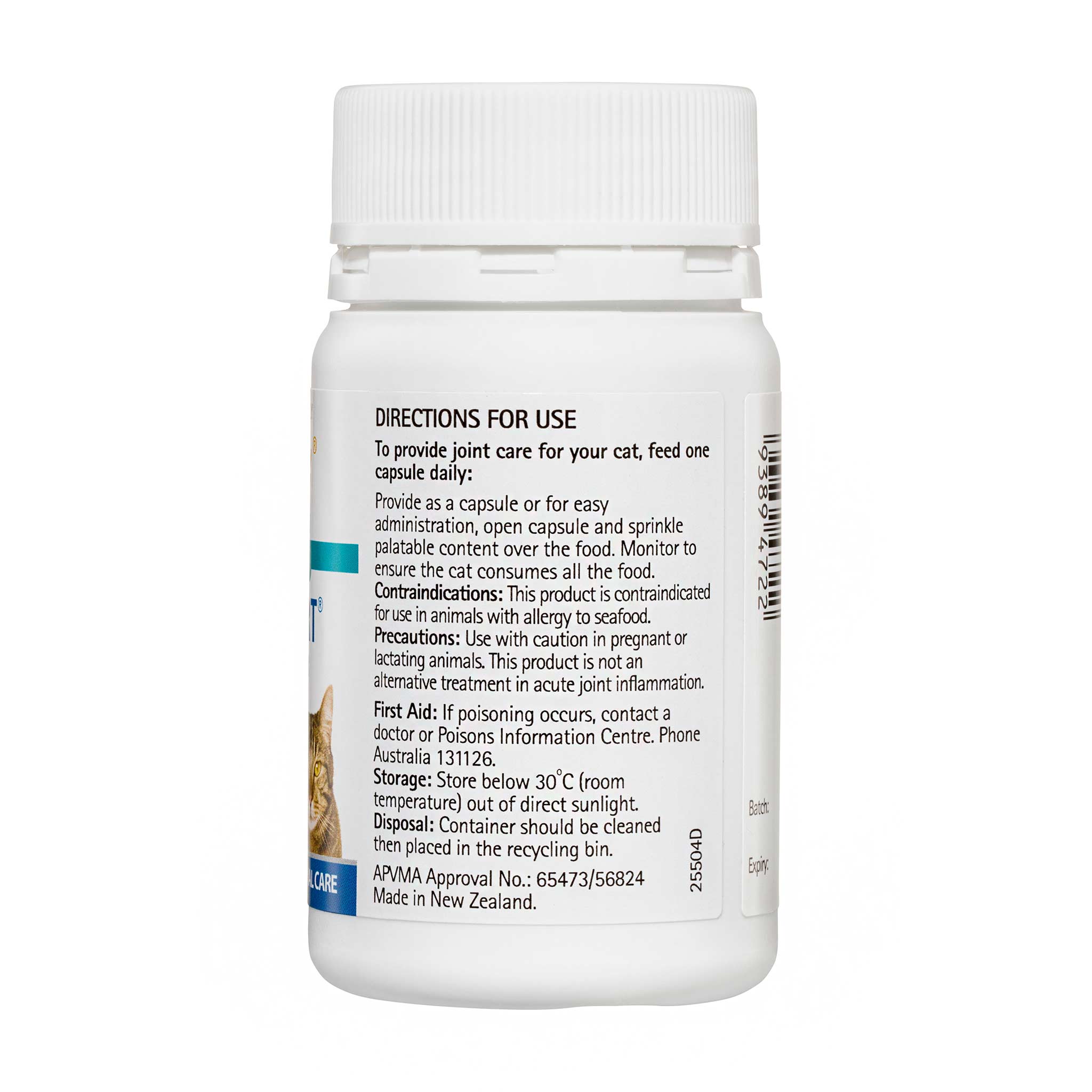 Purchased for elderly cat (19 years and 9 months) who has had stiff arthritic front leg for about 6 years. Lately been very stiff and not happy with life. Unbelievably from first dose he was noticeably happier and moving more freely. I break the capsule open and empty contents into his feed which he readily accepts. Very, very happy customer (and cat too). Been feeding the supplement for about one week and he is still happy and moving considerably better than before.