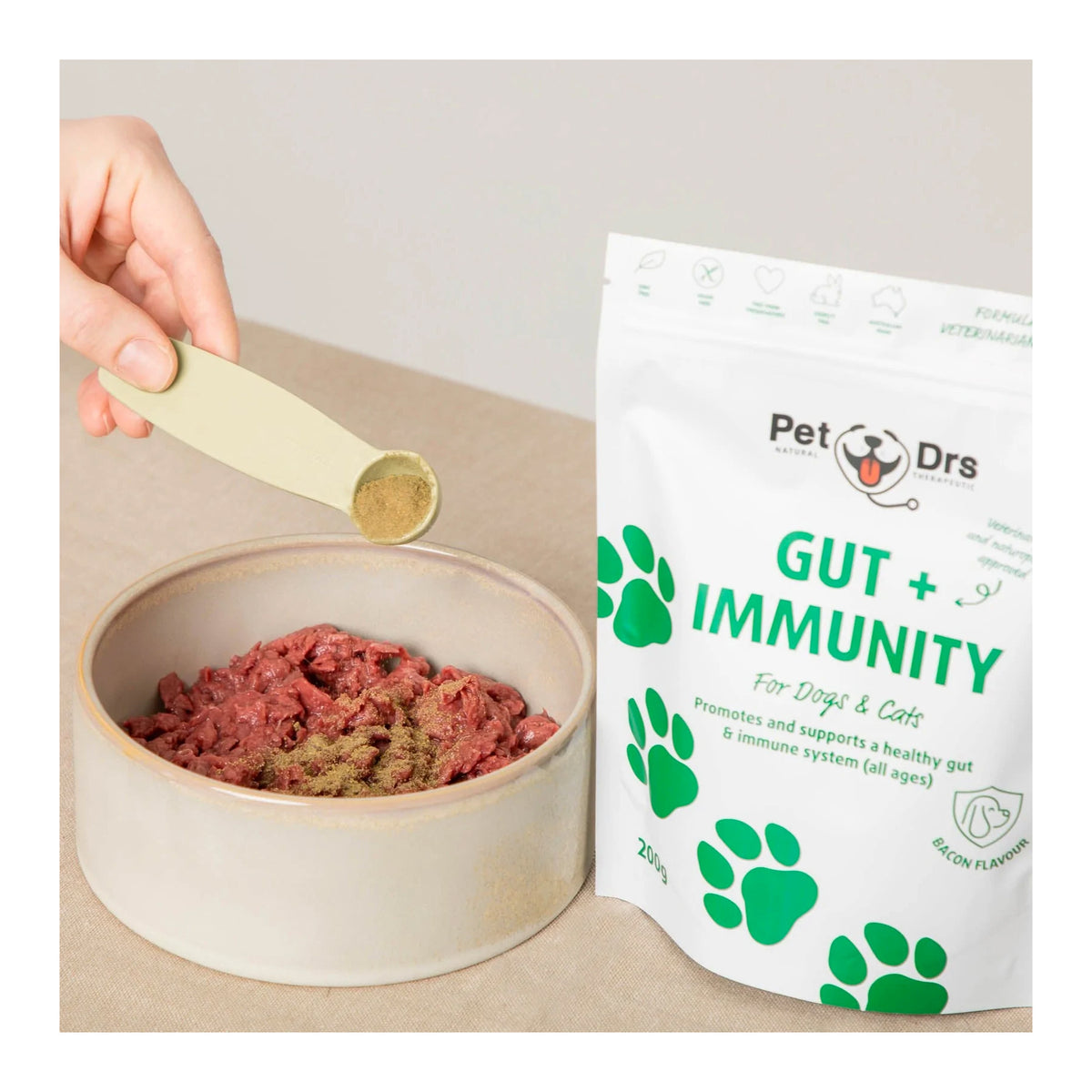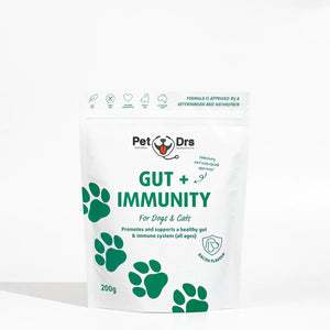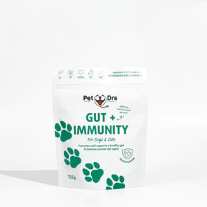 Pet Drs Gut + Immunity is a daily prebiotic and probiotic supplement powder to help support gut health and immune function. Pet Drs multi-strain powder provides good bacteria to help restore and maintain intestinal balance, aid in a healthy microbiome and improve digestion.