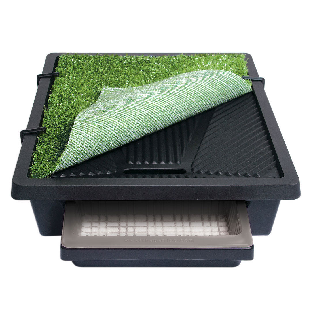 Weekly - Thoroughly spray the Pet Loo with Wee Care and leave it for 5-10 minutes. Remove the grass and wash down the entire unit with a hose, shower, or sink sprayer. Allow it to dry completely.