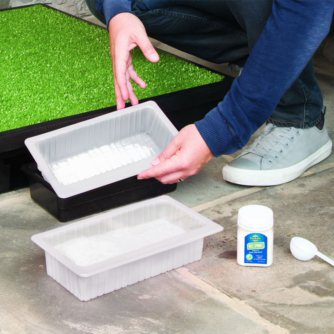 To clean up your pet’s waste, remove the waste container and dump the urine in your toilet or yard. The waste container holds 2 litres of liquid and is made of a material that reduces odour. For even easier cleanup, place a Pee Pod into the waste container. These disposable pods are lined with our Wee Sponge powder that solidifies into a gel when it comes in contact with liquid, effectively trapping urine and odours. 1 disposable Pet Pod and a sample amount of Wee Sponge powder is included with your Pet Loo, and you can also purchase additional packs separately. For your pet’s solid waste, use a pooper scooper or a poop bag.