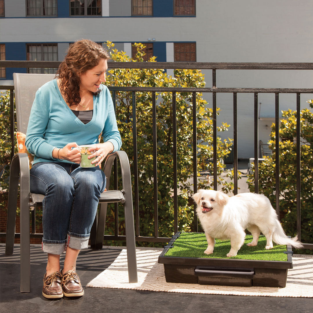 After living in a house with a garden, I moved into an apartment and got a new wool carpet. I also have a Frenchie called Frankie (who was used to going to the loo outside). You can imagine how this might have been a wee problem - but not with the Pet Loo. I put it on my balcony, and to give him some encouragement to use it, dabbed some of his wee from one of his outside walks onto the new plastic grass. He got the idea instantly, and to encourage him even more, he gets a treat when he uses it. It's now become a nightly ritual he looks forward to before bed. Another life saver has been sprinkling powdered 'wee sponge/pee pod powder' into the tray every time I clean it it. It completely eliminates all the odour and turns it into a jelly so it's easy to dispose of. I got the largest size and it's perfect. If you are dubious about if your dog would use it, I honestly say it's been unbeweevable! I highly recommend it.