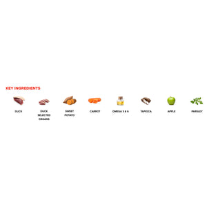 Ingredients: Australian Duck meat (whole meat & selected organs), sweet potato, carrot, tapioca, safflower oil, apple, vitamins and minerals (vitamin A, vitamin D, vitamin E, vitamin K, thiamine (vitamin B1), riboflavin (vitamin B2), niacin (vitamin B3), calcium pantothenate (Bit B5), pyridoxine HCI (vitamin B6), cyanocobalamin (vitamin B12), folic acid, zinc sulphate, zinc chelate, iron chelate, manganese sulphate, potassium iodate, potassium chloride, seaweed extract, sunflower lecithin, flaxseed oil, parsley, buffered vinegar, salt, algae oil, mixed tocopherols, glucosamine sulphate, chondroitin sulphate, Bacillus Subtilis (probiotic), taurine, citric acid.