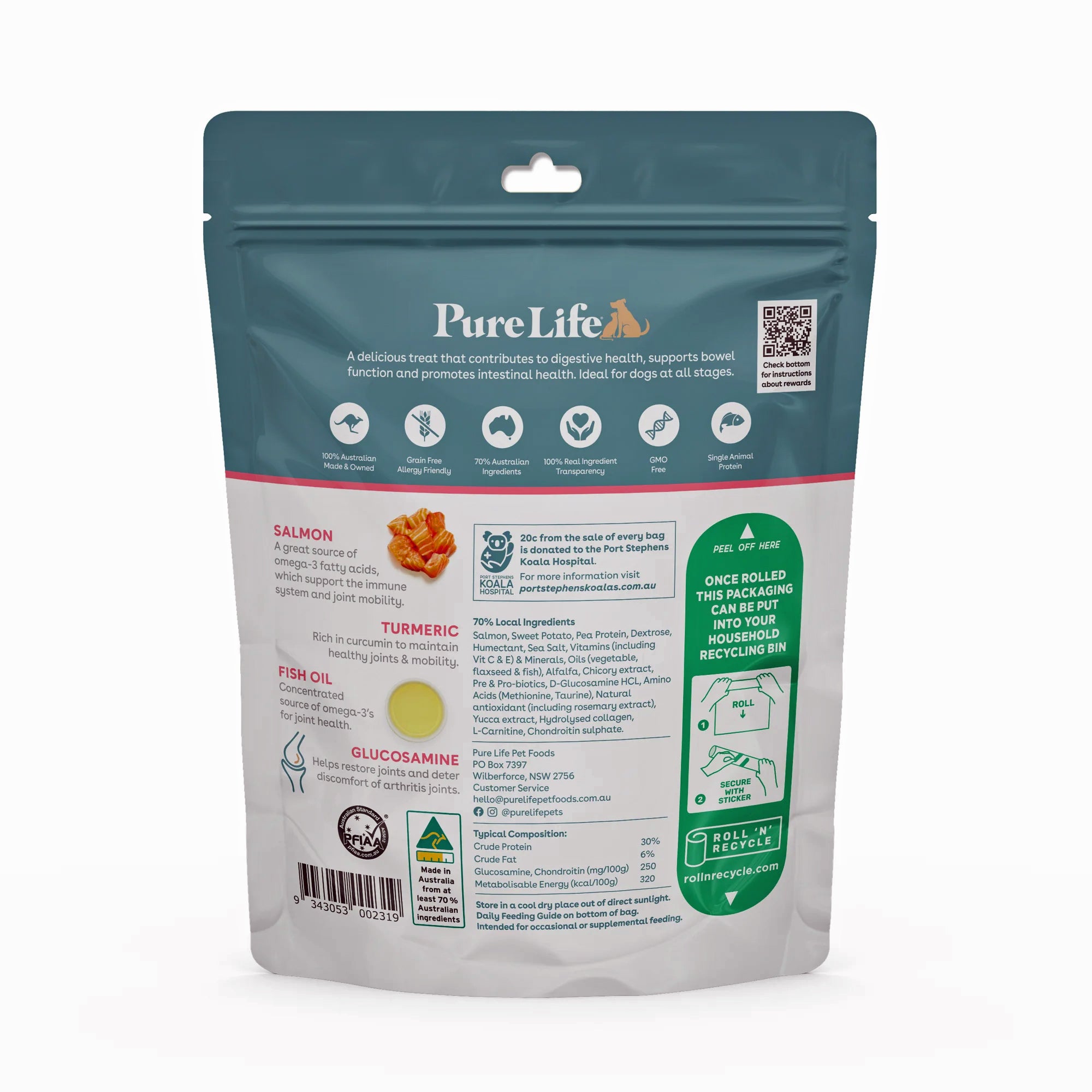 Pure Life Hypoallergenic Salmon Treats are delicious treats that contribute to the support of mobility and peak ”dancing” abilities and are boosted with glucosamine, collagen, fish oil and turmeric.