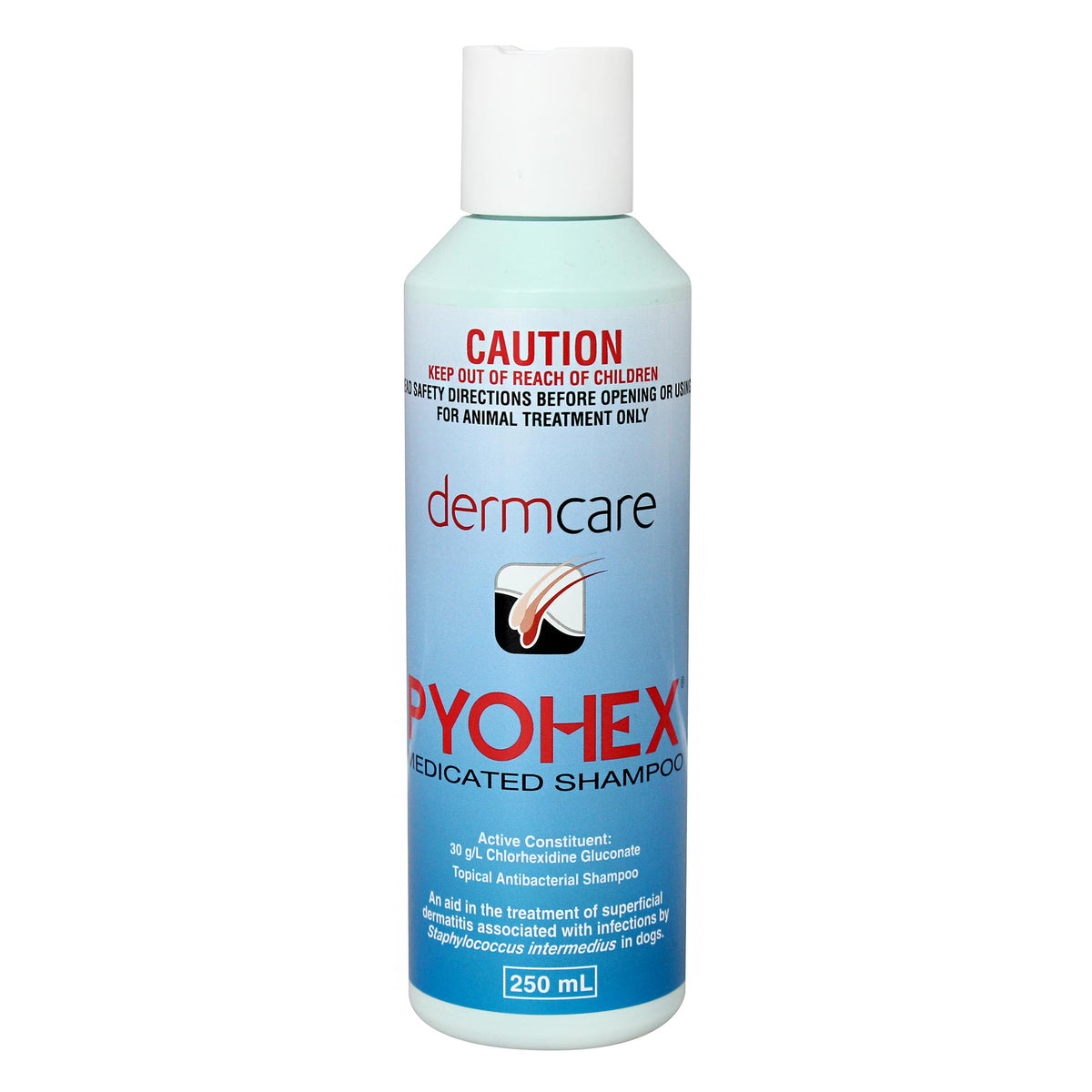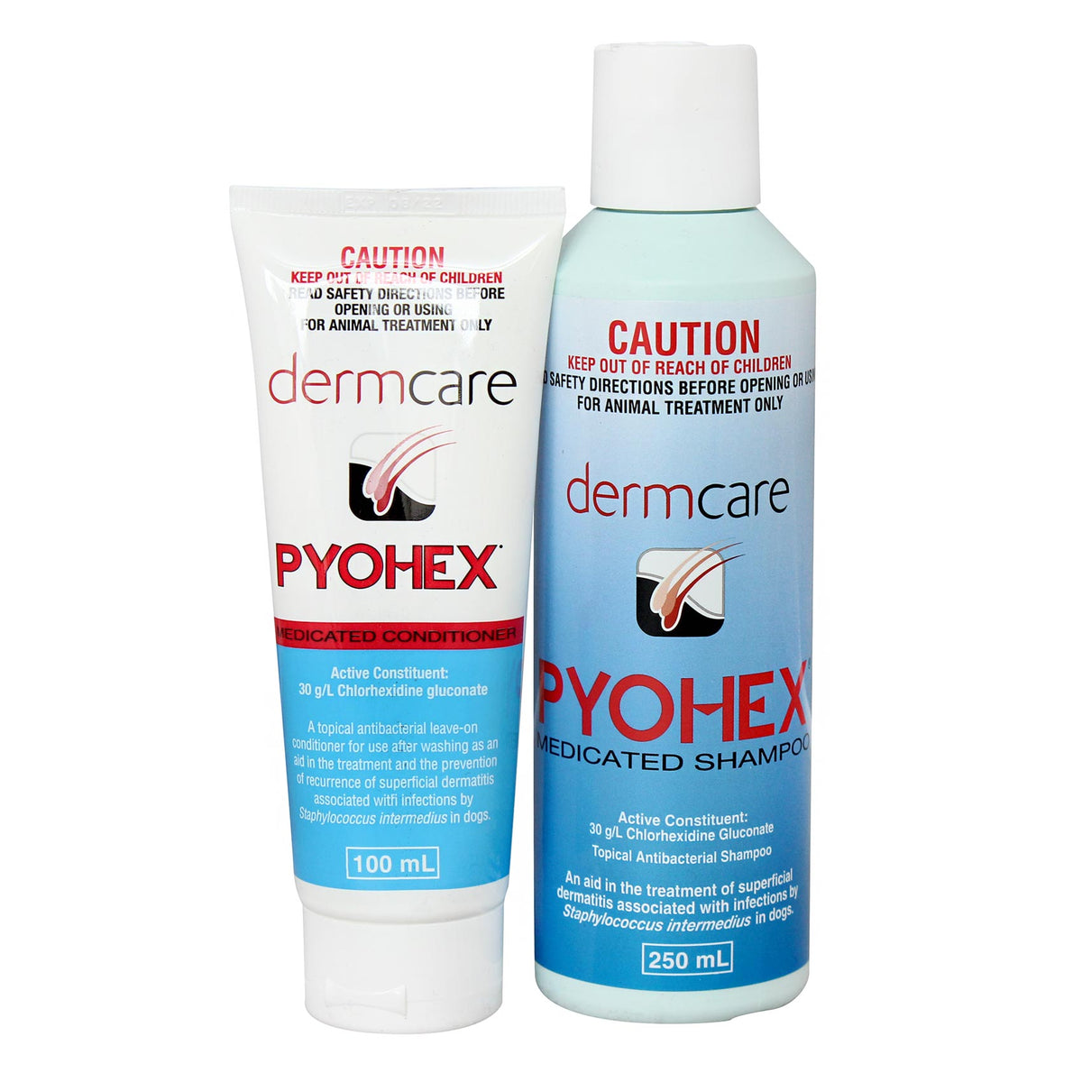 Pyohex Medicated Shampoo and Conditioner are for the treatment of bacterial (Staphylococcal) skin infections in dogs. Bacterial skin infections on dogs can have a wide variety of symptoms or appearances and causes.
