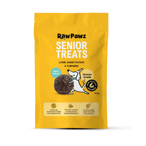 Formulated with senior dogs in mind, Raw Pawz Senior Treats are softer treats and are loaded with anti-inflammatory ingredients like sweet potato flour, flaxseed powder, turmeric, turkey tail mushroom powder, and glucosamine to promote healthy joints and mobility. Perfect for keeping your older pup happy and healthy in their golden years!
