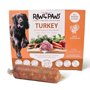 Raw4Paws Turkey is a single-protein recipe made from 83% human-grade Australian turkey meat, organs, and ground bone, plus carefully measured vegetables, fruits, essential fatty acids as well as the Raw 4 Paws Signature Blend of power ingredients. Lean and complete, this turkey recipe is an allergy-friendly, grain-free option rich in amino acids and bone-strengthening nutrients.