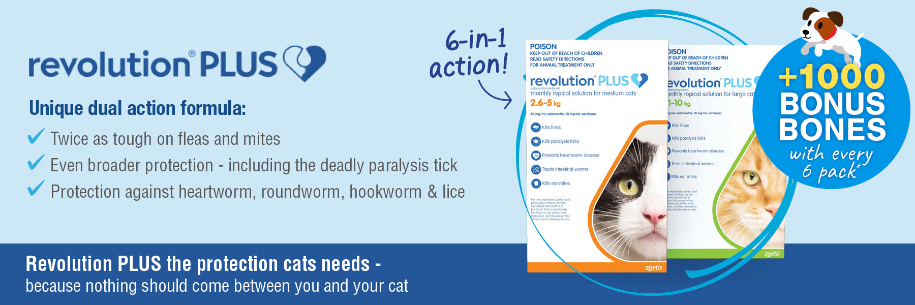 REVOLUTION PLUS is the only 6-in-1 preventative with broad-spectrum action against parasites that threaten cats and kittens over 8 weeks of age and over 1.25 kg.