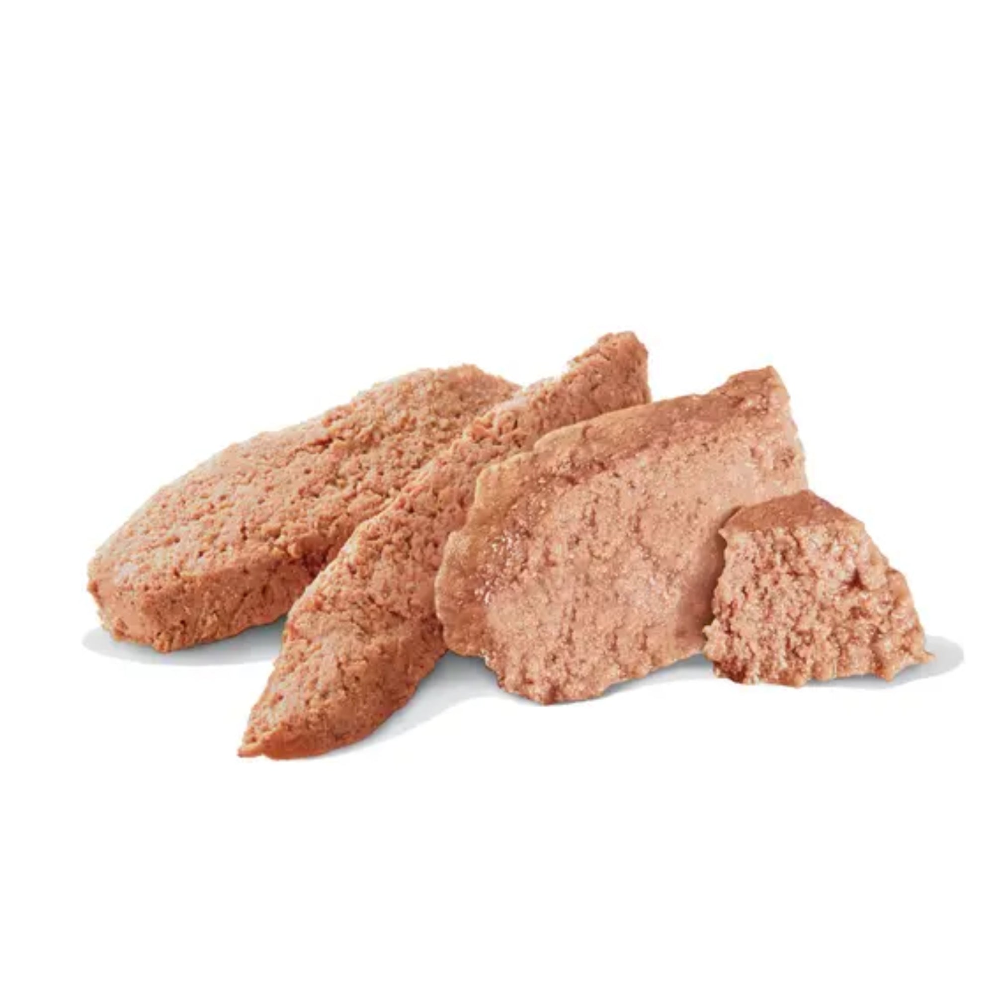 Pork liver, pork meats, corn, rice, minerals, cellulose, sugar beet pulp, taurine, yeast hydrolysate (source of Mannan-Oligo-Saccharides), fish oil, marigold meal (rich in lutein), trace elements (including chelated trace elements), vitamins. ADDITIVES (per kg): Nutritional additives: Vitamin D3: 200 IU, E1 (Iron): 8 mg, E2 (Iodine): 0.15 mg, E4 (Copper): 1 mg, E5 (Manganese): 2.5 mg, E6 (Zinc): 24 mg. ANALYTICAL CONSTITUENTS: Protein: 7.5% - Fat content: 1.7% - Crude ash: 1.5% - Crude fibres: 1.7% - Moisture: 74% - Essential fatty acids: 0.3% including Omega 3 fatty acids (EPA/DHA): 0.03%.