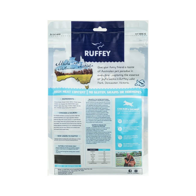 Australian pet nutritionists and animal natural therapists created Ruffey Chicken & Salmon dry dog food mix to give canines a comprehensive and balanced diet.