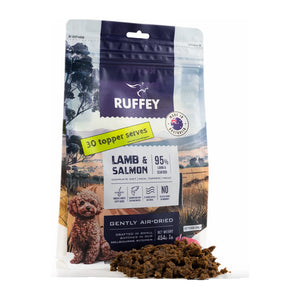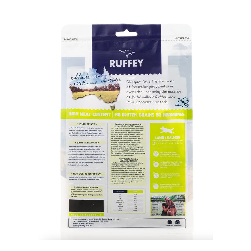 Premium lamb and salmon are combined in Ruffey Lamb & Salmon Recipe Air-Dried dog food to create a meal that is high in protein and simple to digest. It is devoid of grains and abundant in vital vitamins and minerals that support pets' bodily well-being.