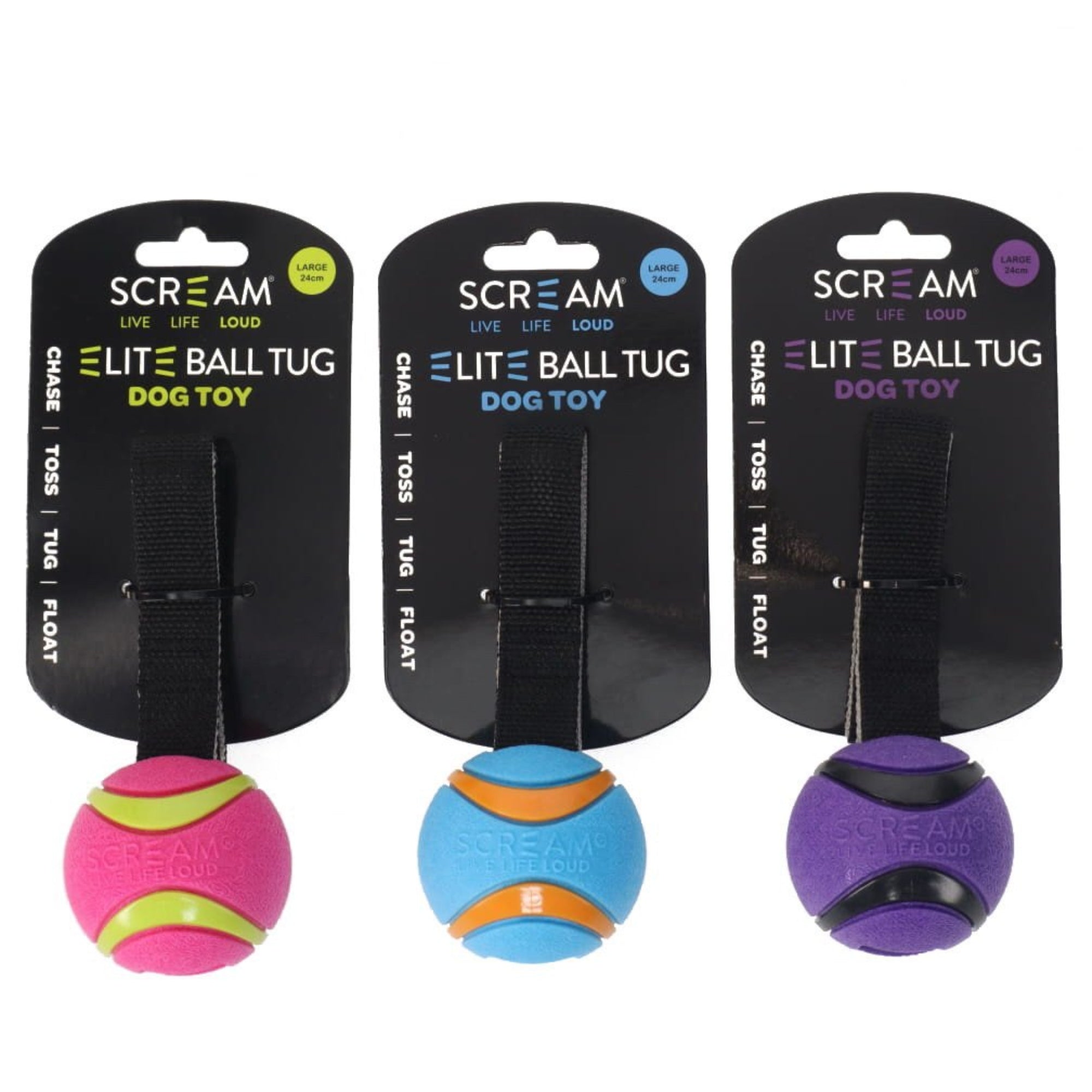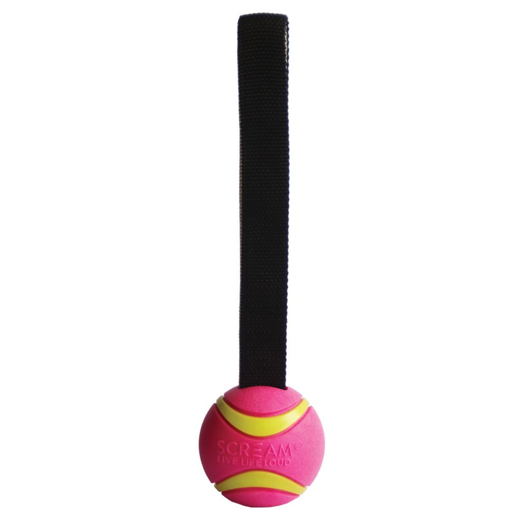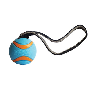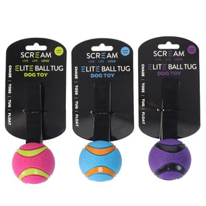 Designed for dogs who love to chase, fetch and tug, the Scream Elite Ball TUG delivers the ultimate playtime experience. This versatile toy features a tough TPR ball paired with a durable nylon handle, making it perfect for games of tug-of-war and fetch!