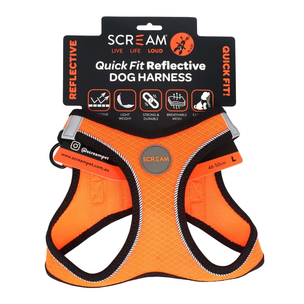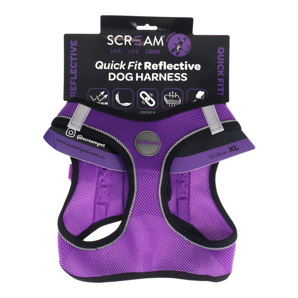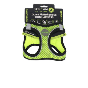 The Scream Quick Fit Reflective Dog Harness is a soft, lightweight and breathable harness that is great for puppies and small-medium sized dogs.