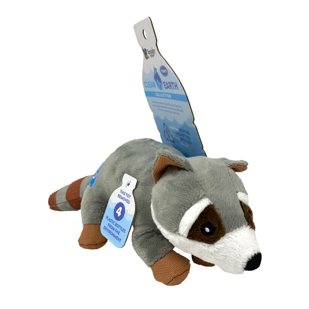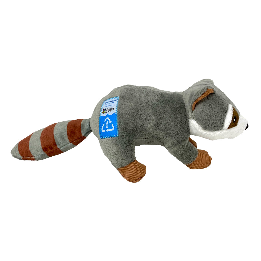 The Spunky Pup Clean Earth Plush Racoon toys are made from 100% recycled plastic water bottles, including the fabric, stuffing, binding, and thread.