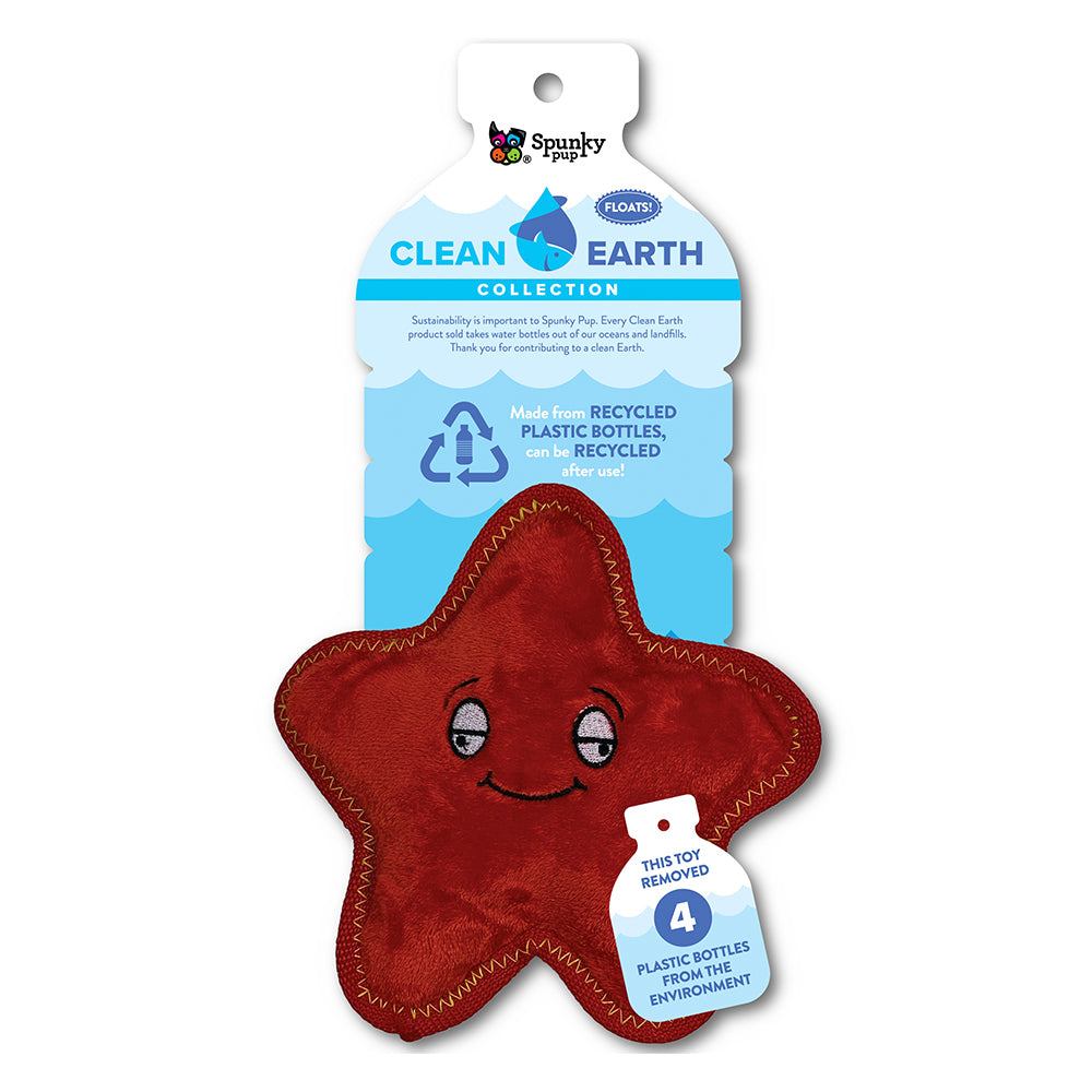The Spunky Pup Clean Earth Plush Starfish toys are made from 100% recycled plastic water bottles, including the fabric, stuffing, binding, and thread.