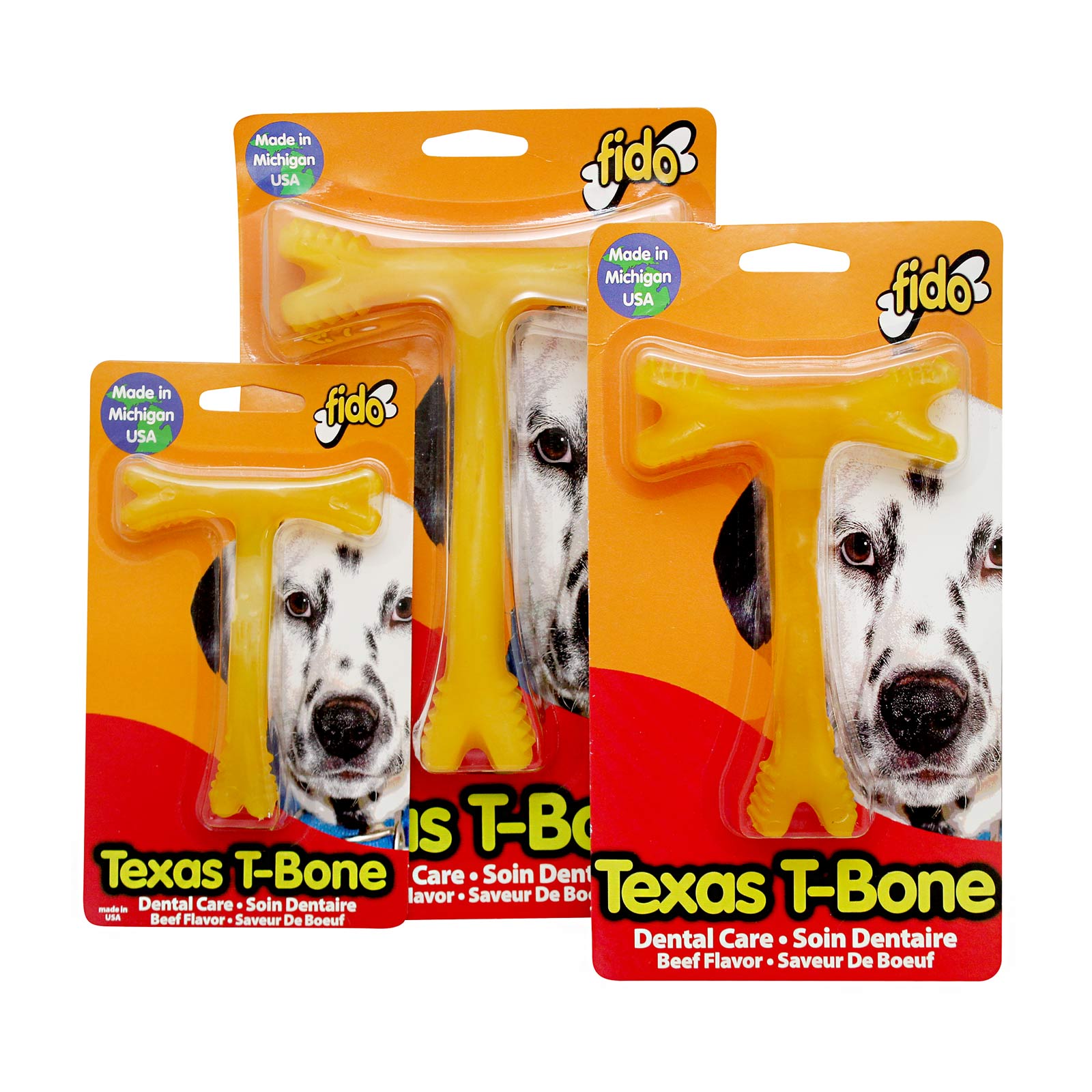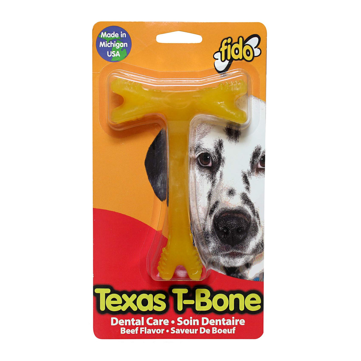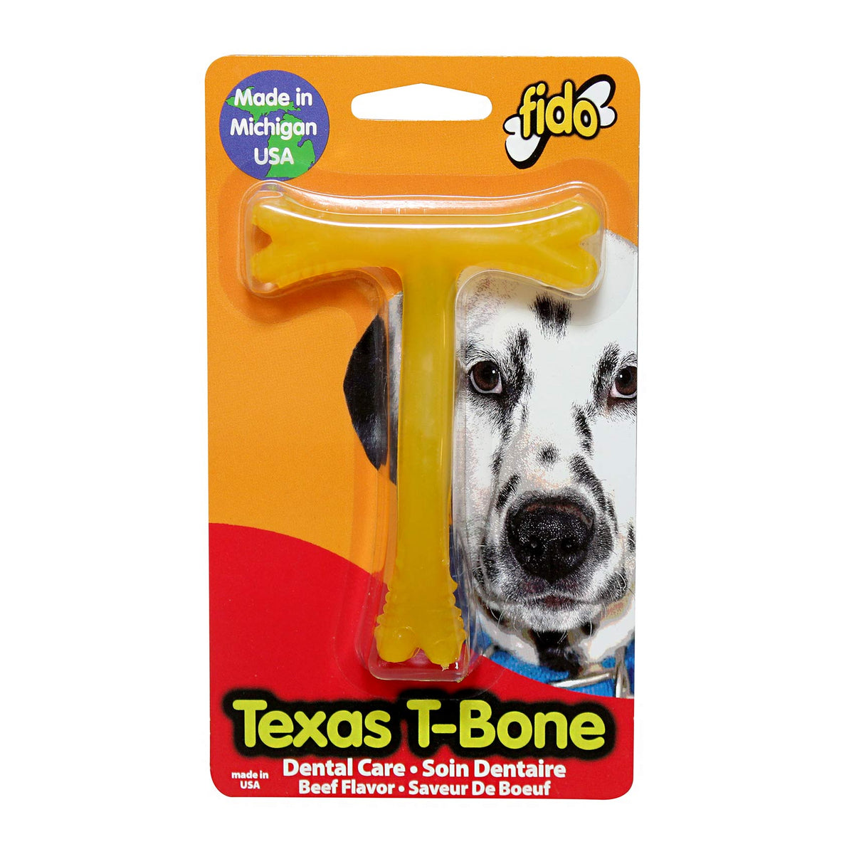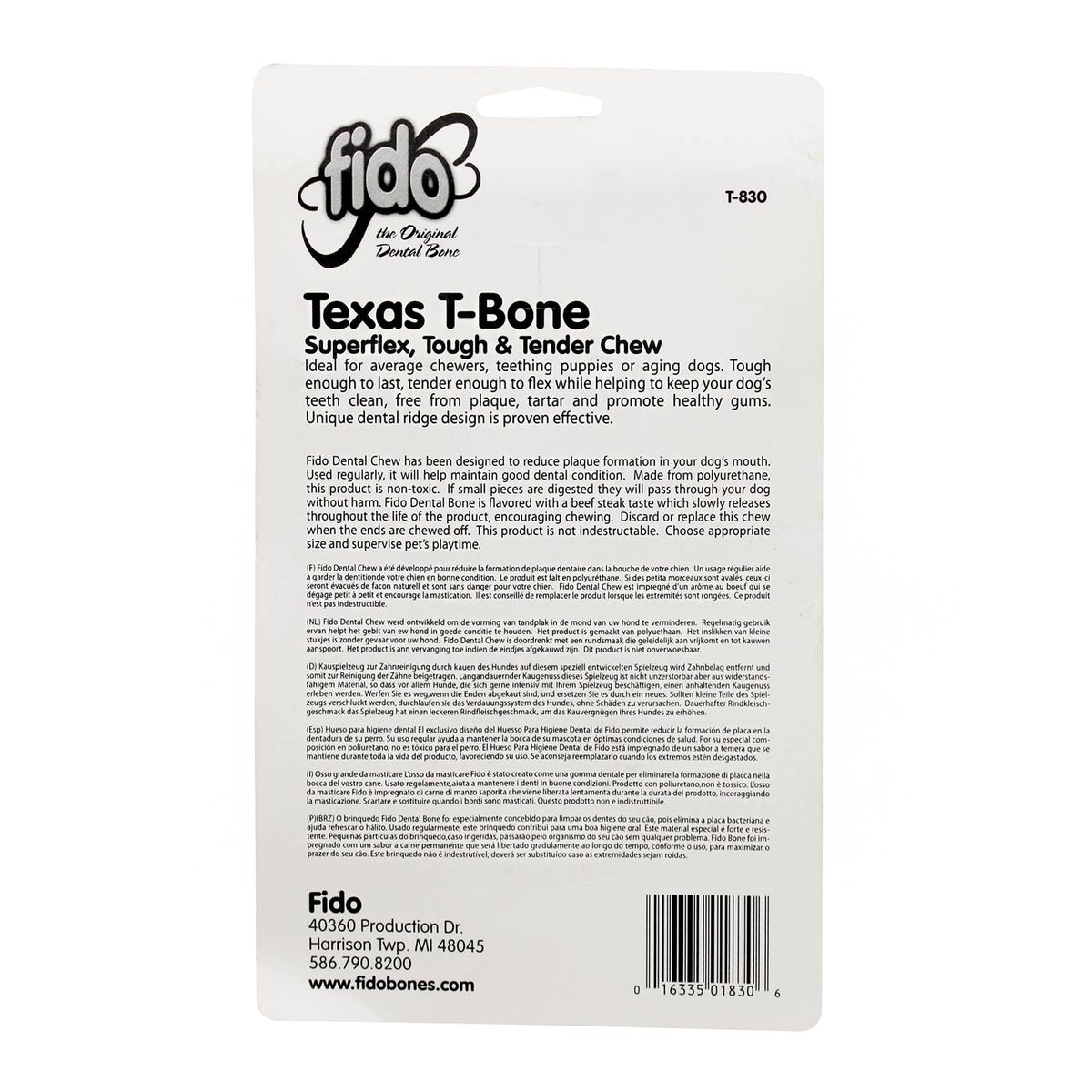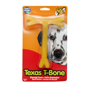 The Texas T-Bone from Fido has been designed to reduce plaque formation in your dog's mouth. Used regularly, it will help maintain good dental condition. Made from polyurethane, this product is non-toxic. If small pieces are ingested, they will pass through your dog without harm. The Texas T-Bone is flavoured with a beef steak taste which slowly releases throughout the life of the product, encouraging chewing.